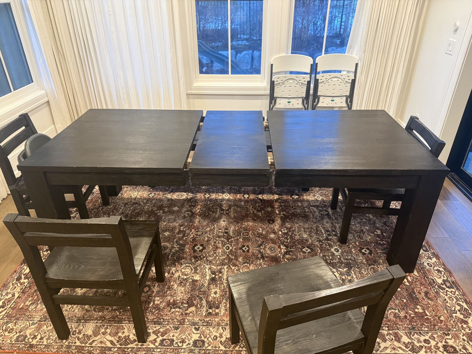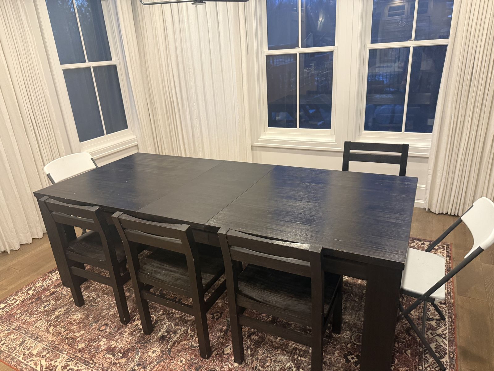 ZelleWe bought this Pottery Barn dining table set a few years ago and are selling it due to moving and getting new furniture for our space. This set includes 1 dining table, 4 chairs, and 1 bench. The table sits 6 people and includes an extension leaf to fit up to 8 when needed. This set originally cost us $4000 and we are selling it for $900 to avoid storing it before our new table arrives. Below you will see the pottery barn item numbers to look up details.