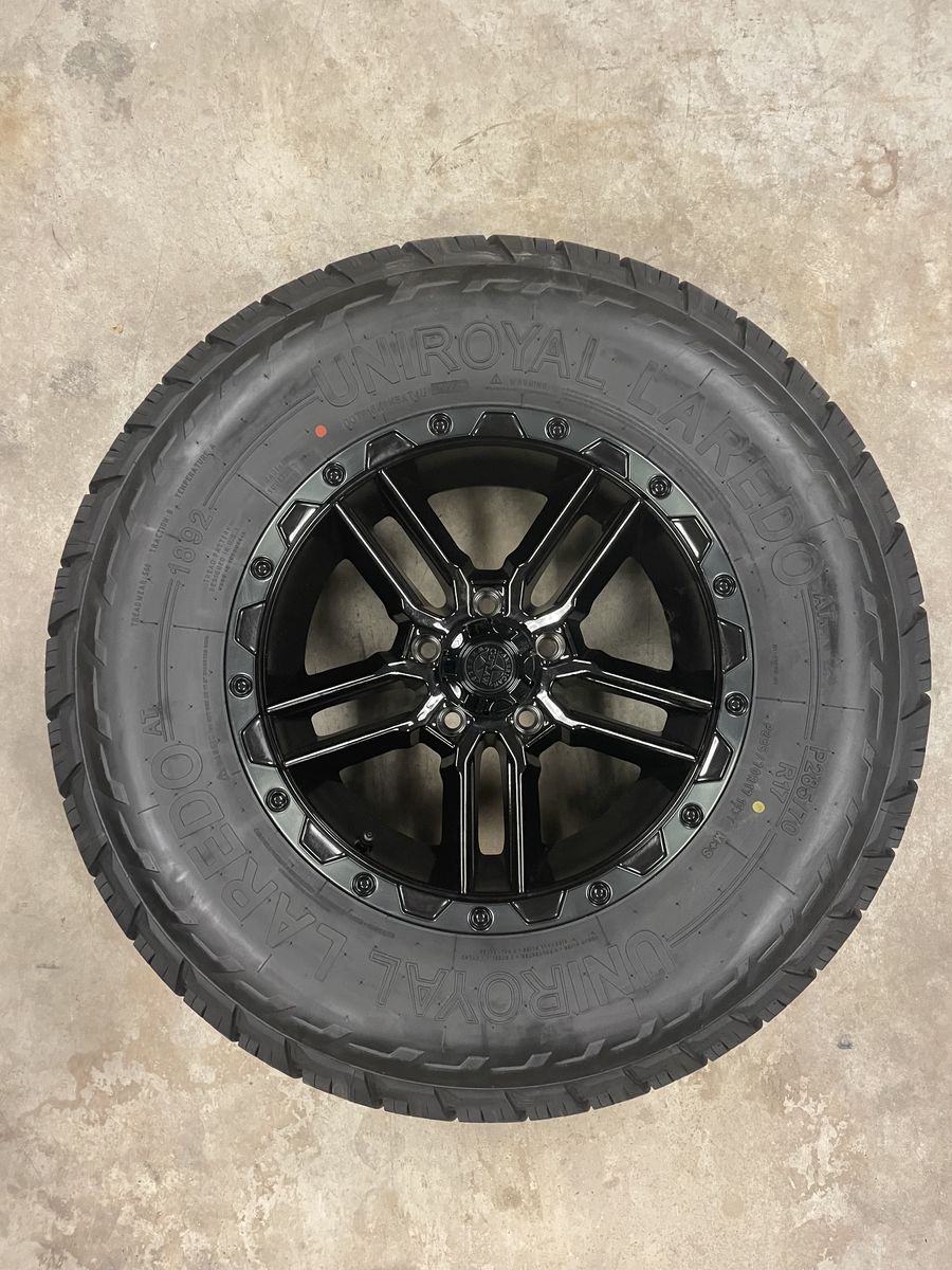 VenmoAmerican Outaw Railcar 17x8.5 wheels 5x127mm with 10mm back spacing. Uniroyal Laredo, all-terrain tires 285/70R17. Wheels and tires are like new with only around 900 miles.
