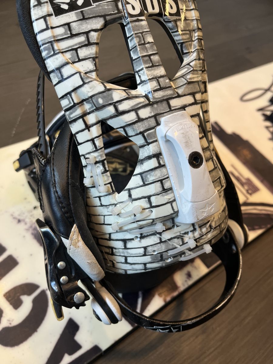 I’ve never ridden this board, it was given to me and I’ve had it stashed for a couple years. One of the bindings is broken and held together with zip ties.