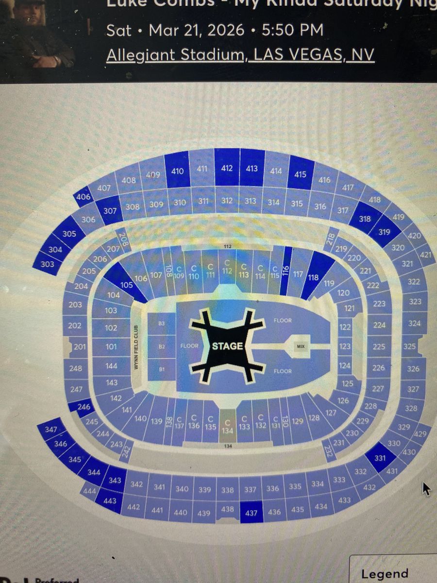 Venmo2 tickets to the Luke Combs Concert -- Saturday, March 21st at the Allegiant Stadium in Las Vegas. Section 125 Row 26 Seats 13 & 14. $198.00 each. Great seats!