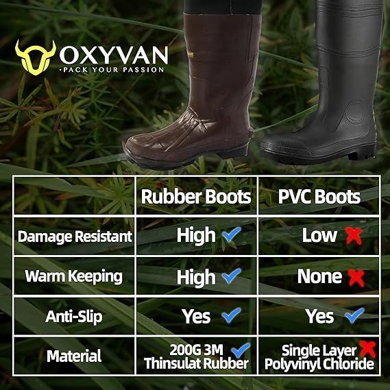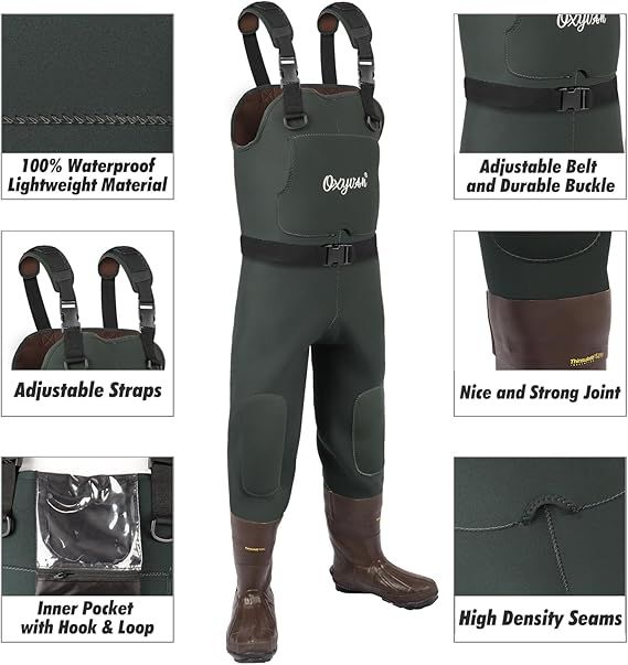 About this item - Durable & Sturdy – OXYVAN Fishing Waders with boots are made of 100% waterproof 4.5 mm neoprene material and also has excellent insulation properties. With great material, stretch liner and triple-finished seams that are stitched, glued and taped.