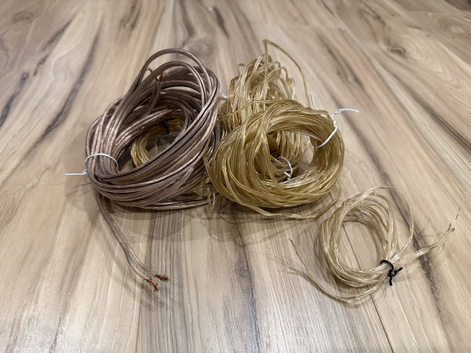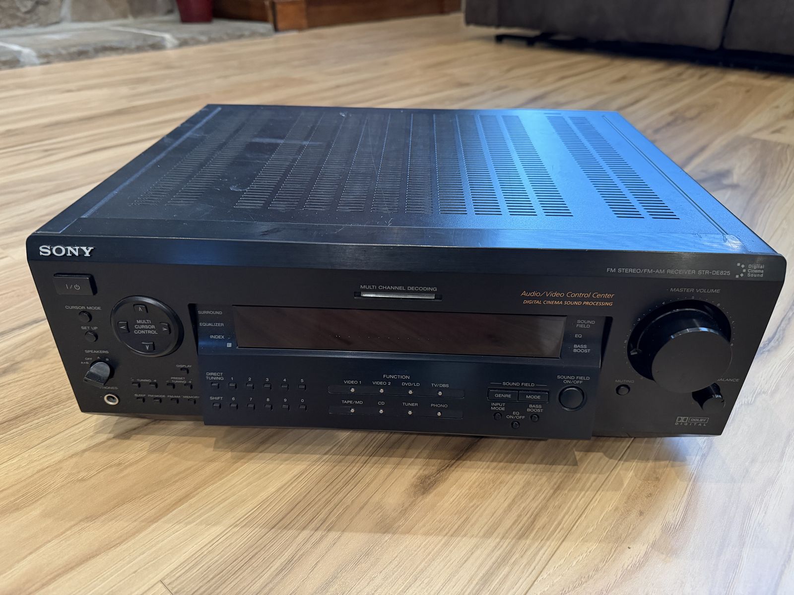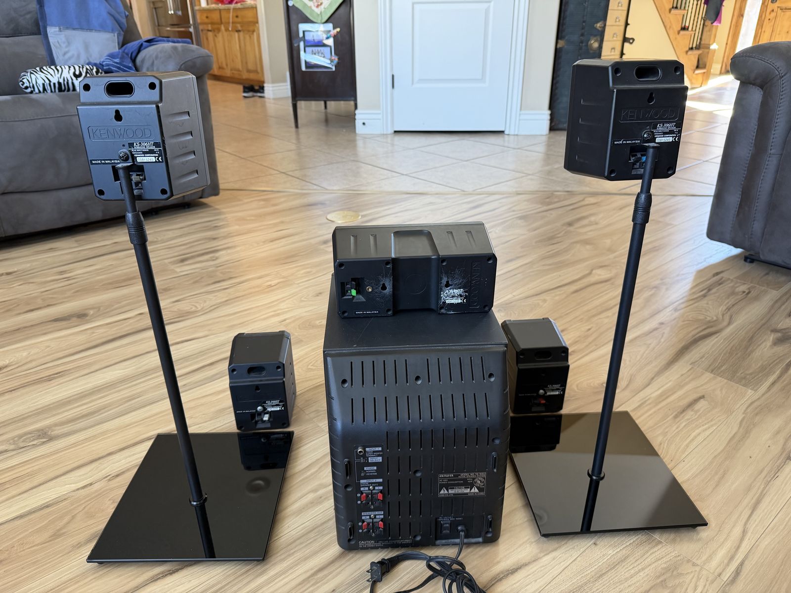 Speaker set for 5.1 surround sound. Includes 2 front speakers, 2 rear speakers on adjustable pedestals, center speaker, and subwoofer. Sony receiver for 5.1 surround sound. Lots of speaker wire.