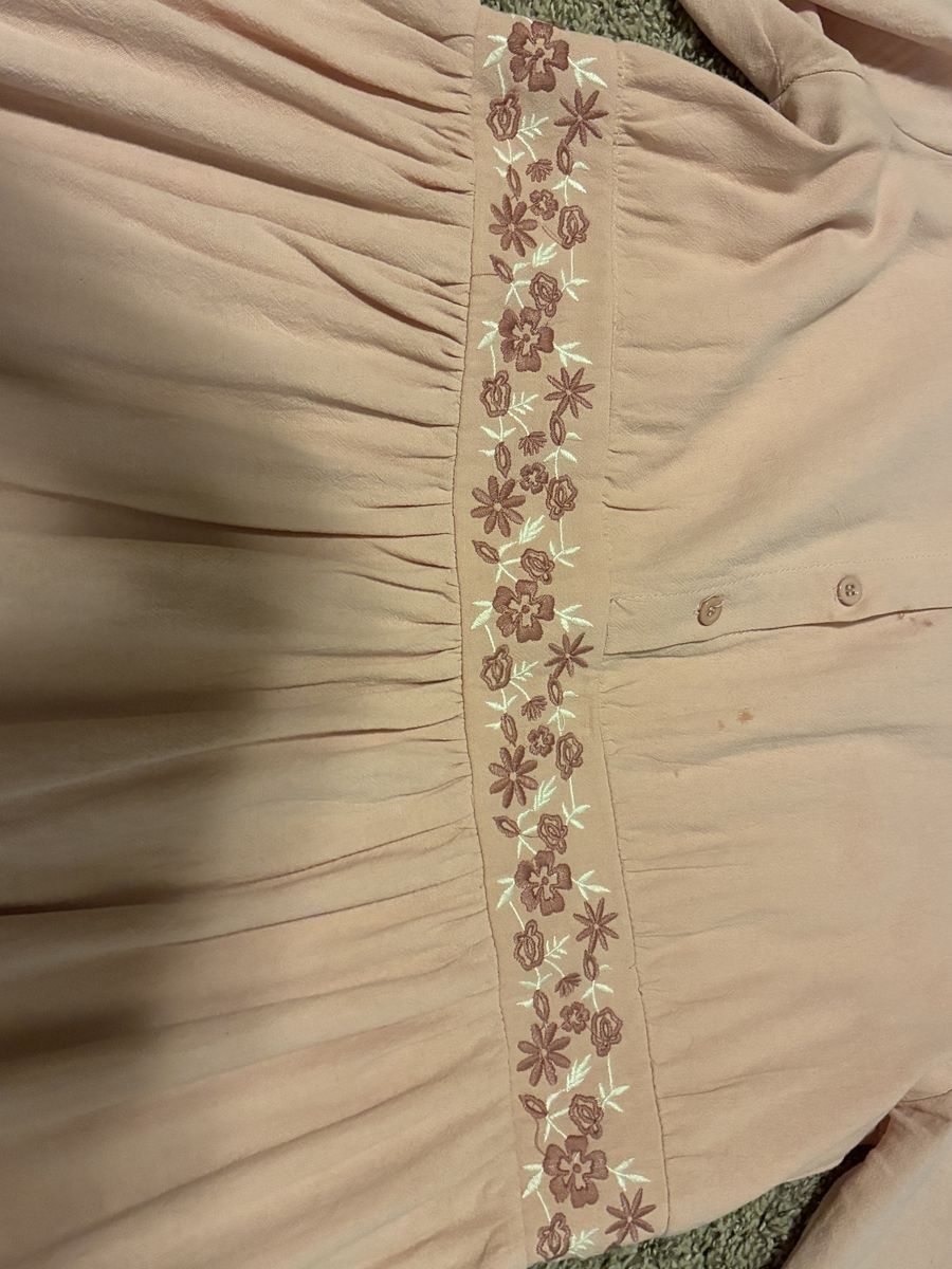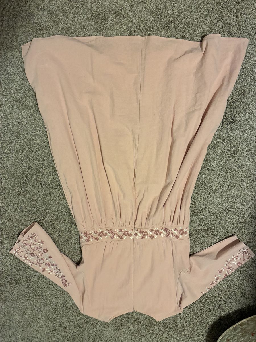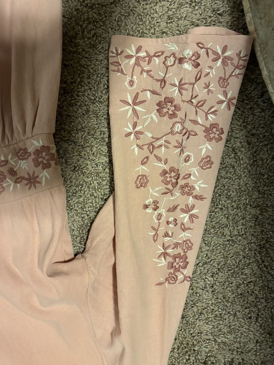 VenmoSize Large. Pink dress. 45" long, 15" sleeves. Round neckline. Floral design on sleeves, around front and back at waist.