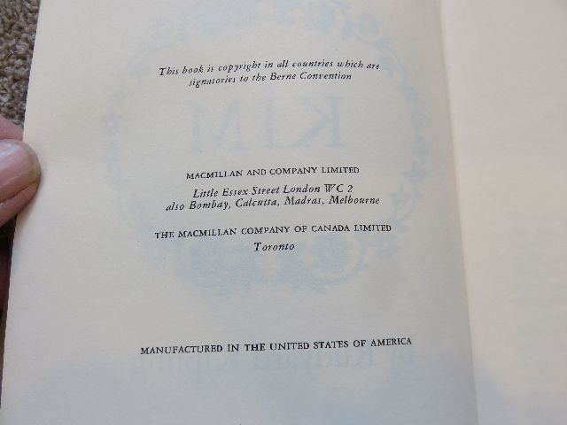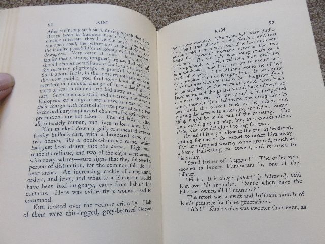 As the pictures show, this vintage version of Rudyard Kipling's "Kim" is in very good shape for it's age. All of the pages are present; there are no torn or ripped pages, and the front, back and spine are in good shape as well.