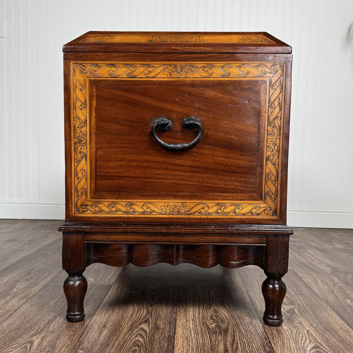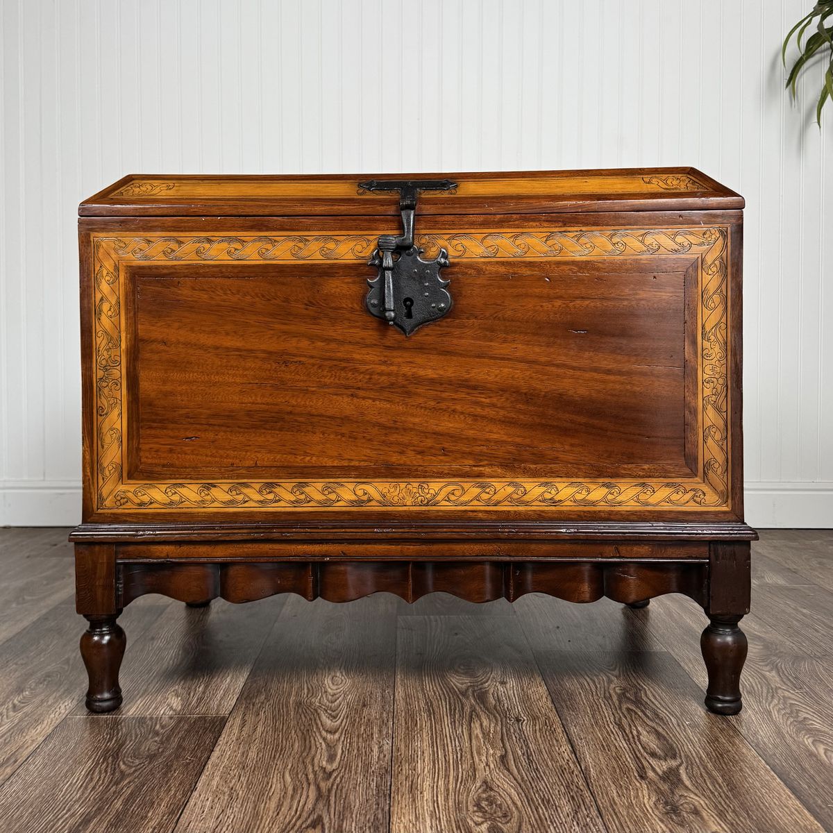 VenmoRare and striking Spanish Colonial trunk by Alfonso Marina featuring an intricate engraved marquetry border, turned legs, a sculpted apron, warm mahogany-toned hardwood, and hand-forged iron hardware.