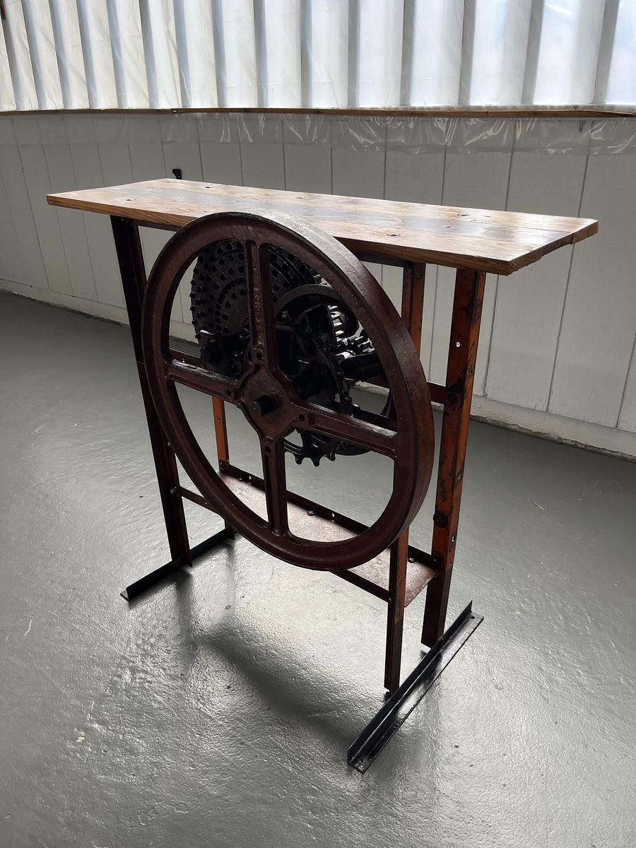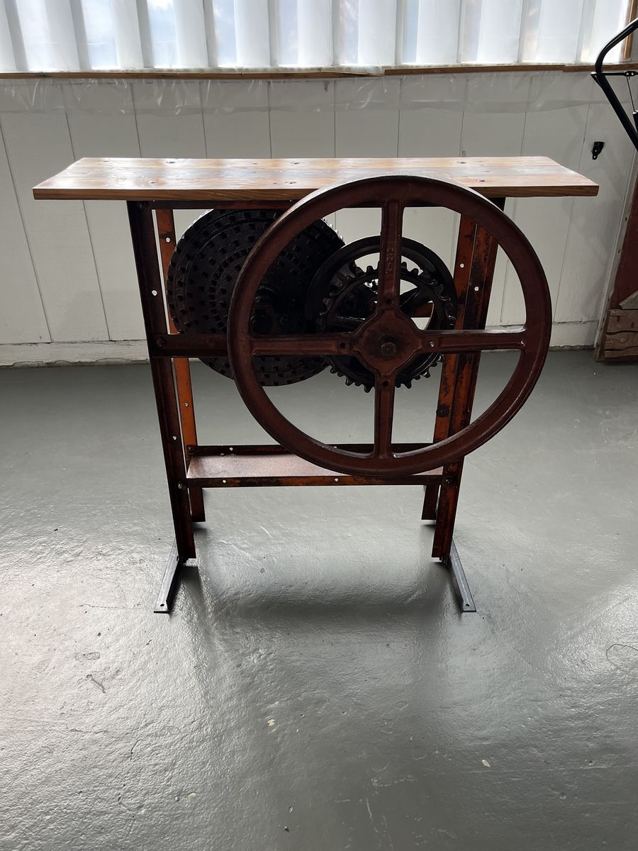 Vintage industrial table, the base of this table came from a old corn sheller machine. This is one of a kind table.. thank you for looking