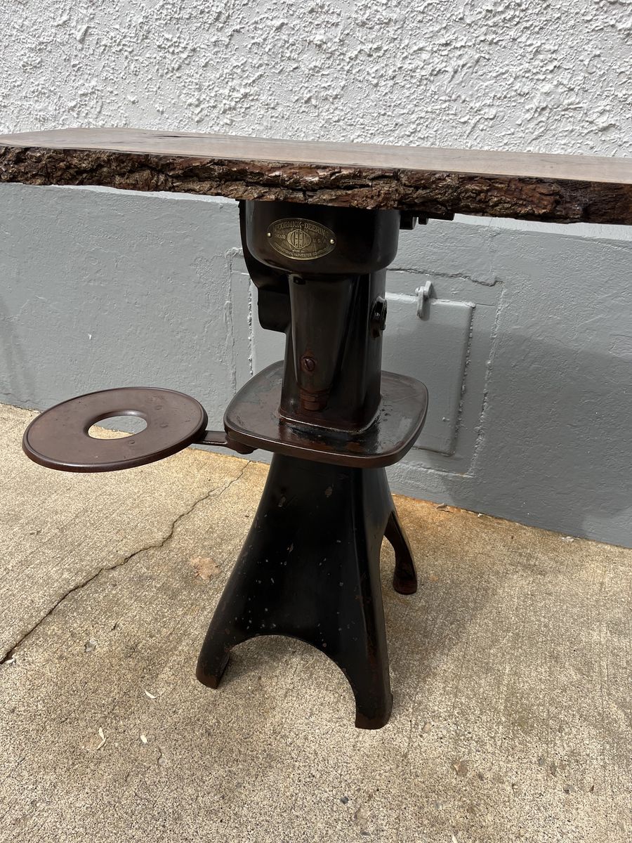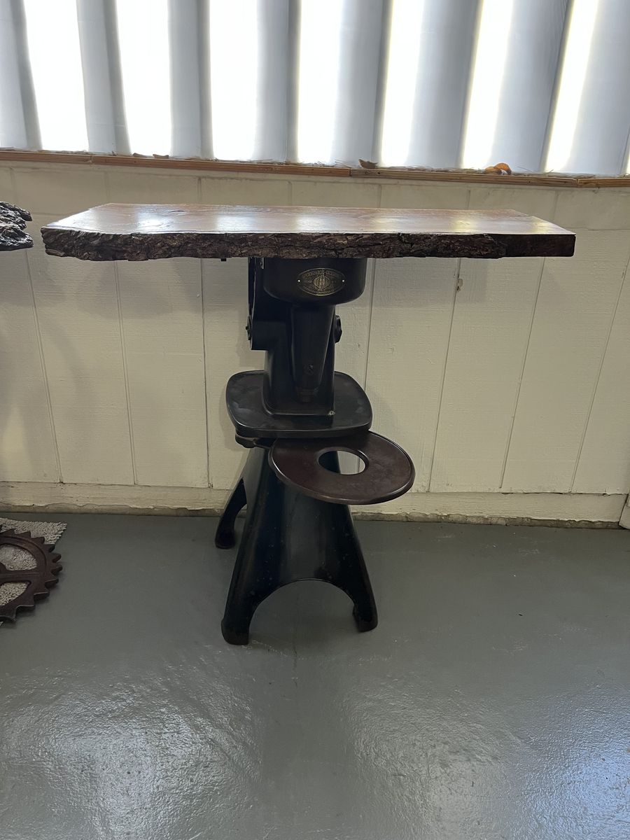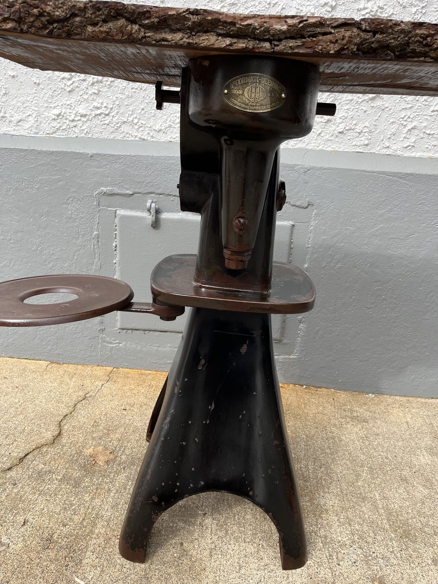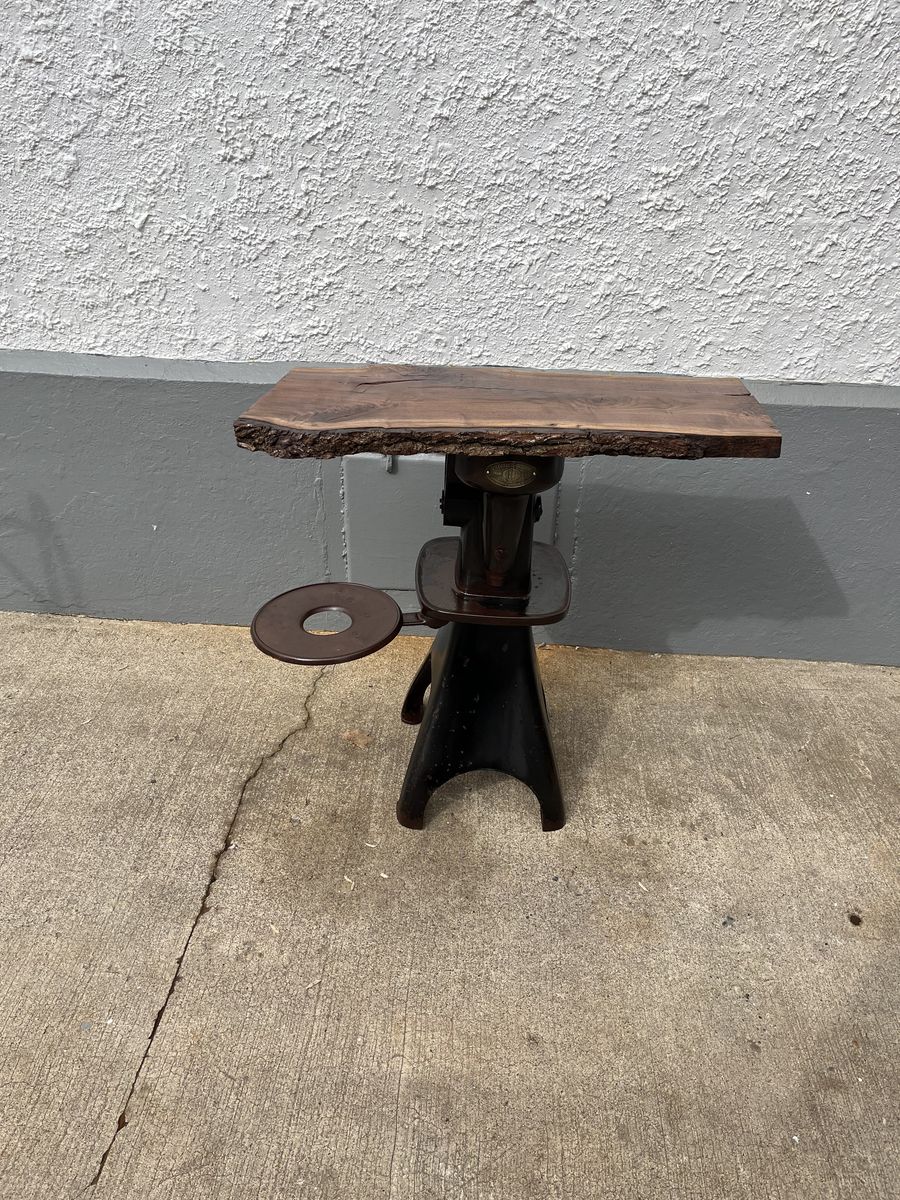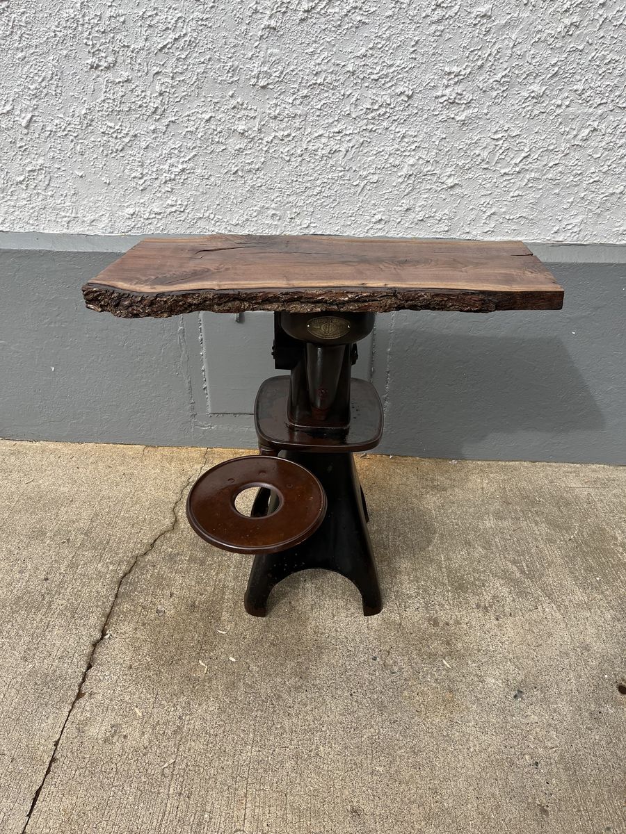The base to this table was a cream separator, the wood on the top is black walnut with a live edge