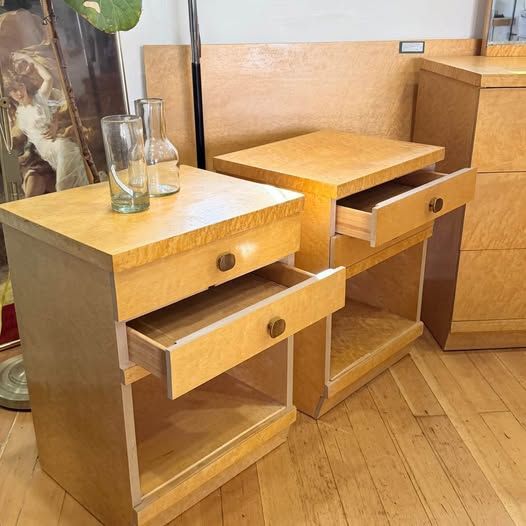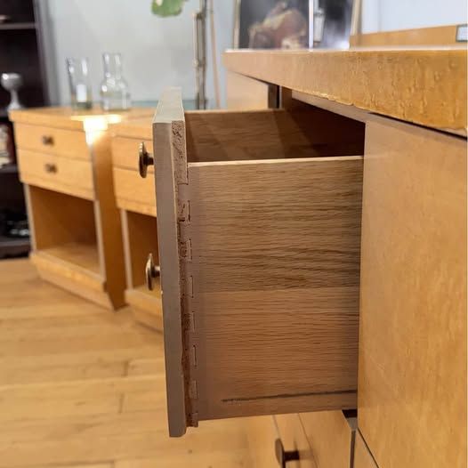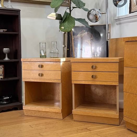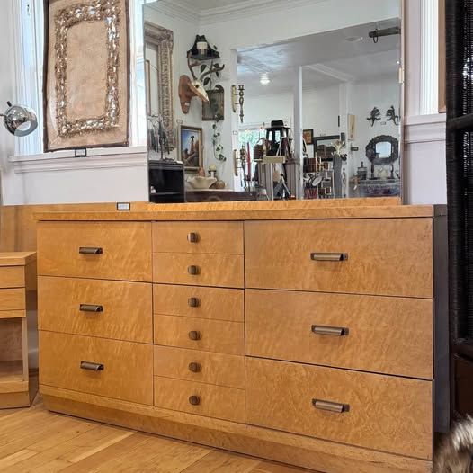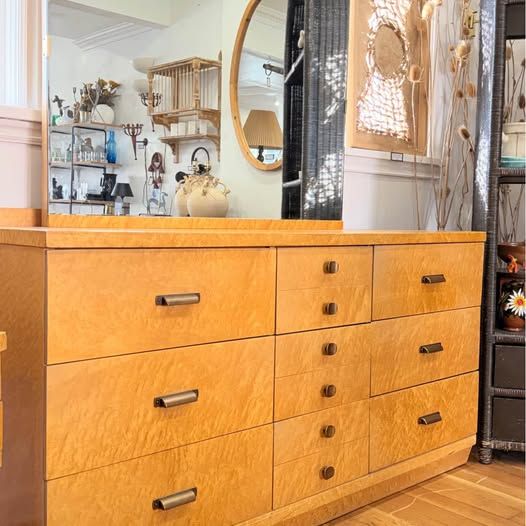 CashAppVintage 1950s Birdseye Maple Bedroom Set: 9-drawer Dresser with Vanity Mirror and Pair of 2-drawer Nightstands