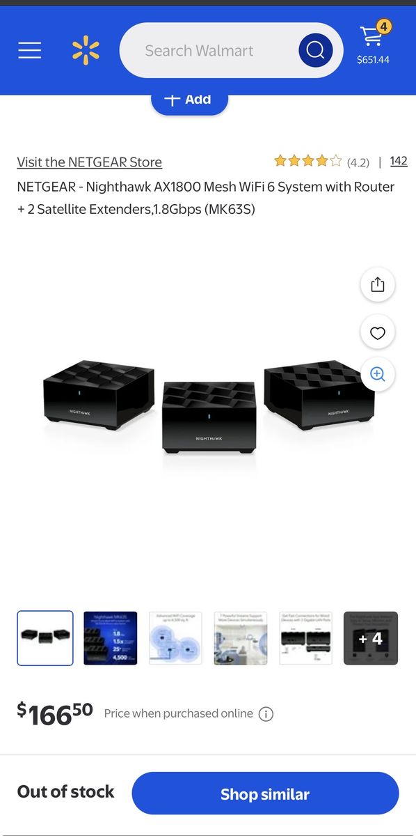 This item is a Netgear Nighthawk AX1800 Mesh WiFi 6 System (model MK63). Provides coverage for homes up to 4,500 square feet. Uses Wi-Fi 6 technology to deliver speeds up to 1.5 times faster than AC Wi-Fi. Includes one router and two satellites to eliminate dead zones. Features Netgear Armor cybersecurity to protect connected devices.