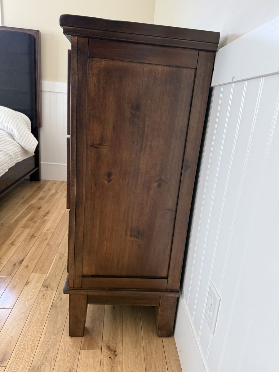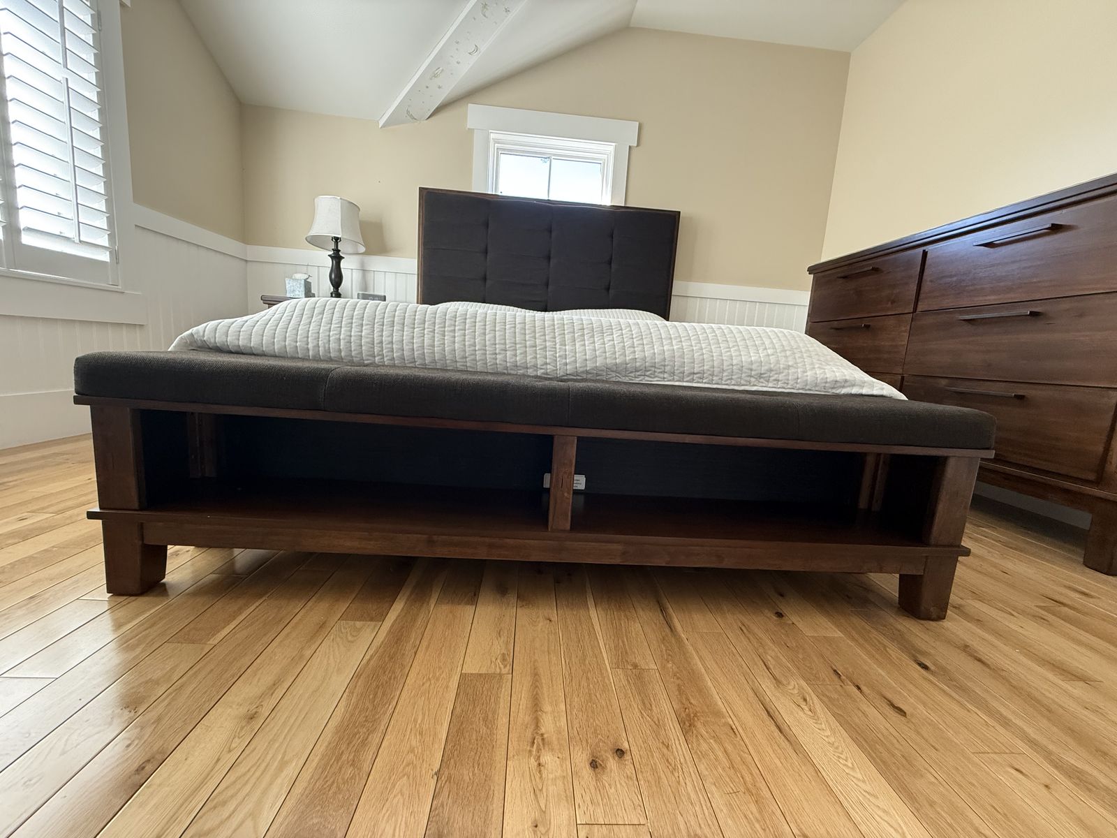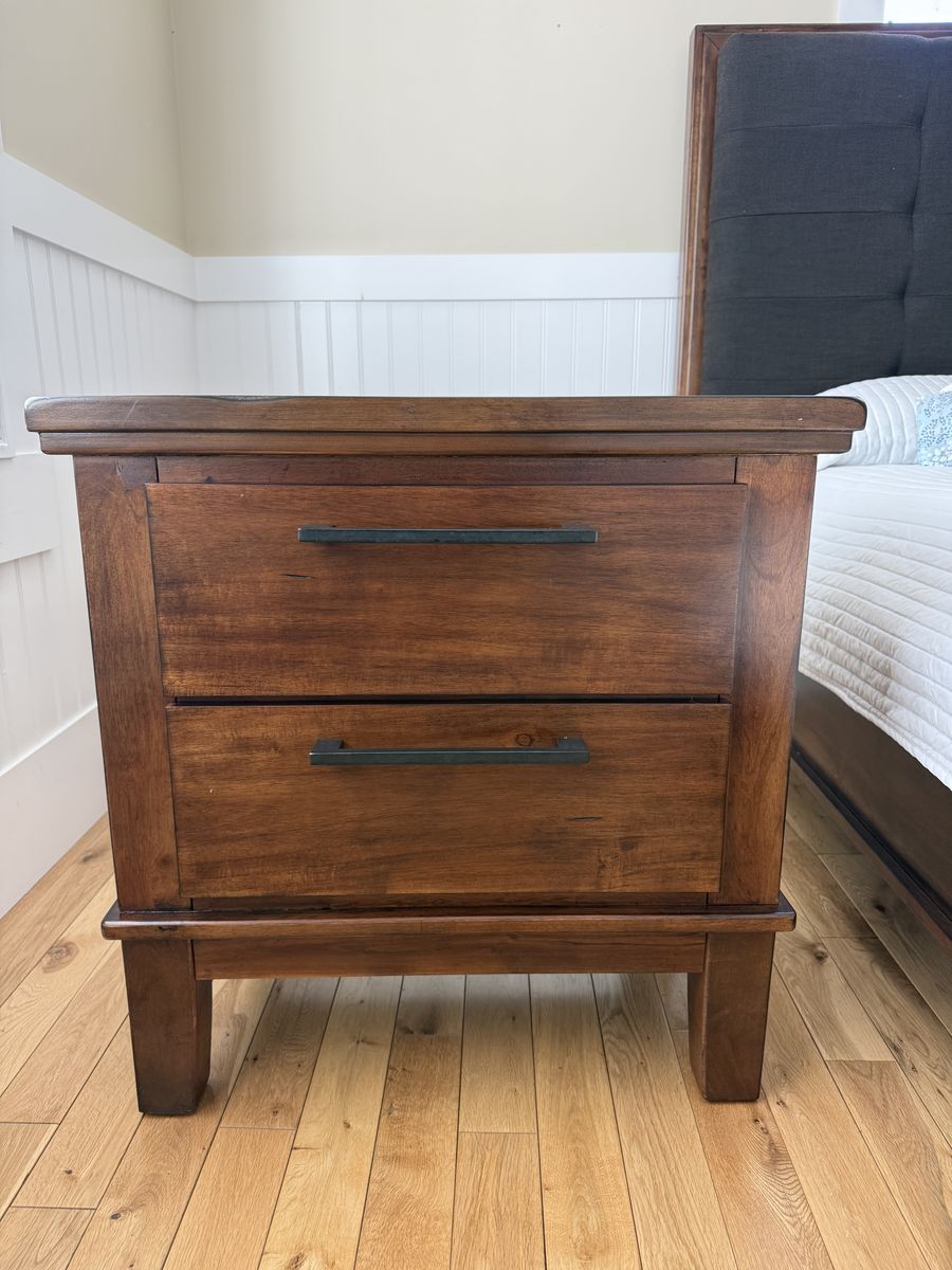 VenmoThree piece wood bedroom set in perfect condition. Platform style queen bed with attached bench / cubby and upholstered bench and head board. We are moving and it doesn’t fit in the new house. Purchased for $2600, includes box spring but not the mattress. Available any day after April 1st. Heavy and well built so it will require some muscles to move. Head board is 72” wide and 62” high Bed is 72” wide, 98” long , 24” high Chest Dresser is 65” wide, 18” deep, 45” high Night stand 28” wide, 18” deep, 29” high