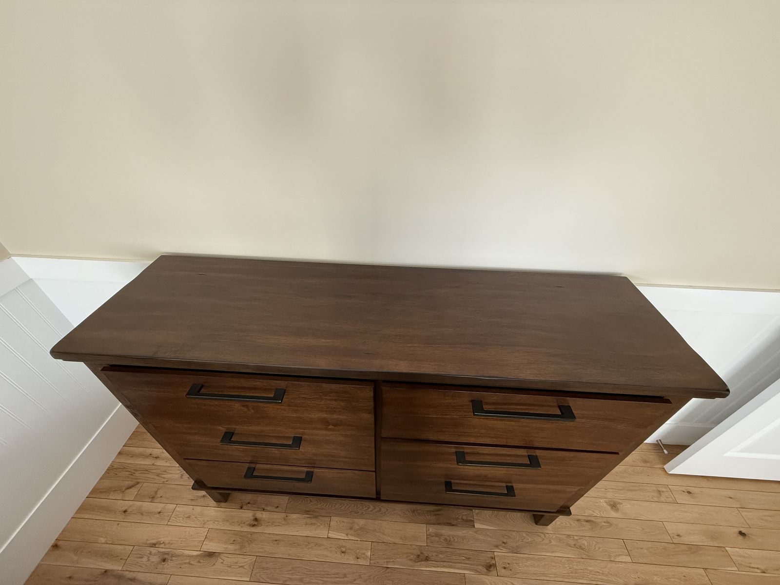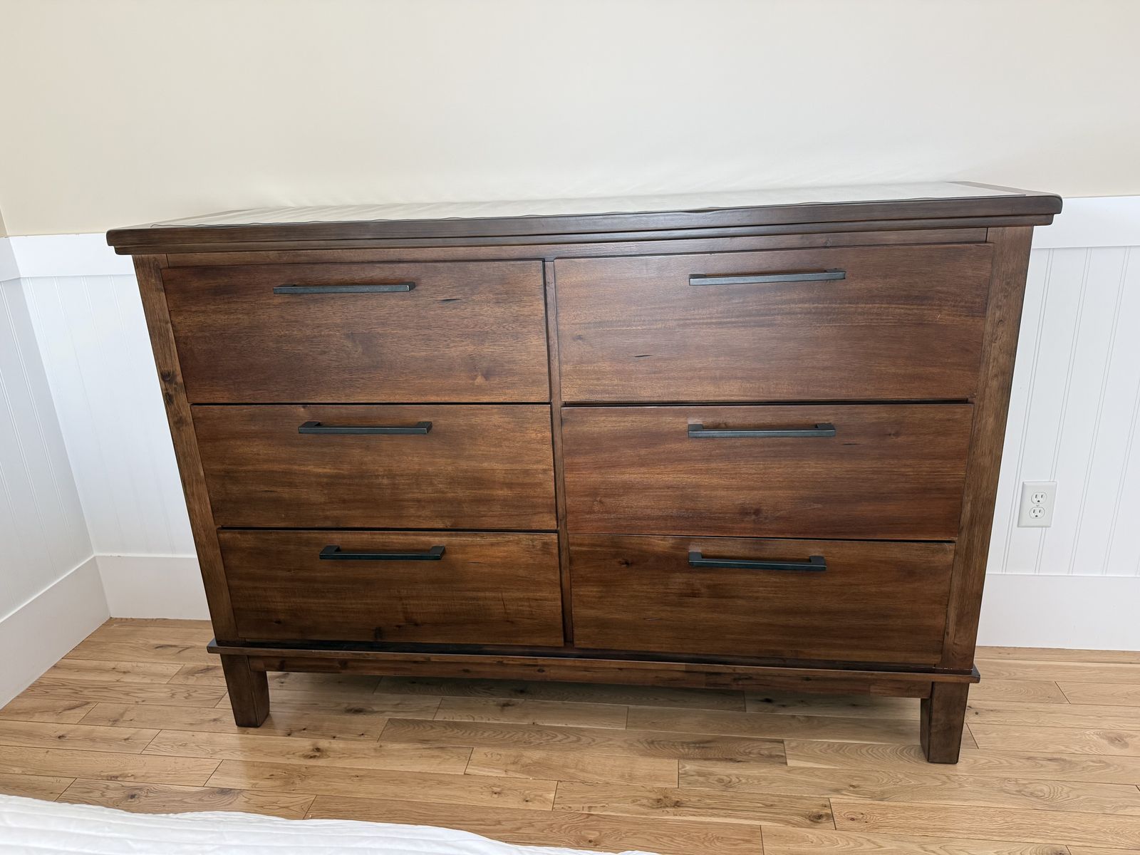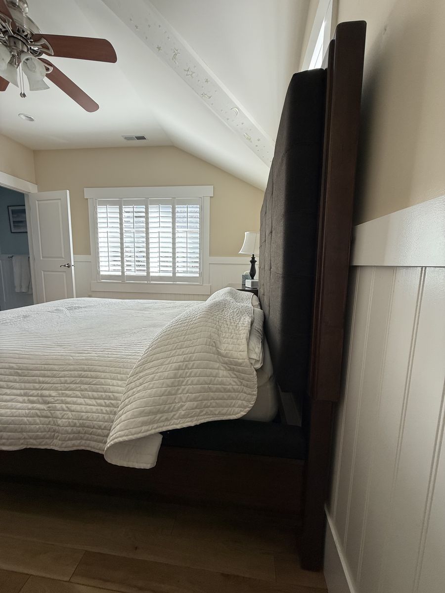 VenmoThree piece wood bedroom set in perfect condition. Platform style queen bed with attached bench / cubby and upholstered bench and head board. We are moving and it doesn’t fit in the new house. Purchased for $2600, includes box spring but not the mattress. Available any day after April 1st. Heavy and well built so it will require some muscles to move. Head board is 72” wide and 62” high Bed is 72” wide, 98” long , 24” high Chest Dresser is 65” wide, 18” deep, 45” high Night stand 28” wide, 18” deep, 29” high