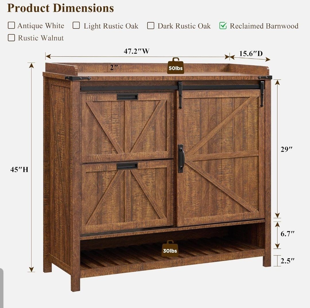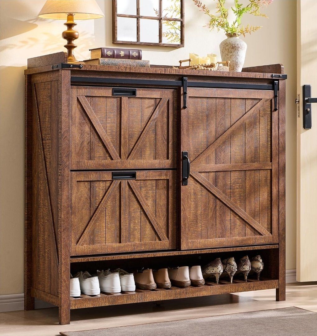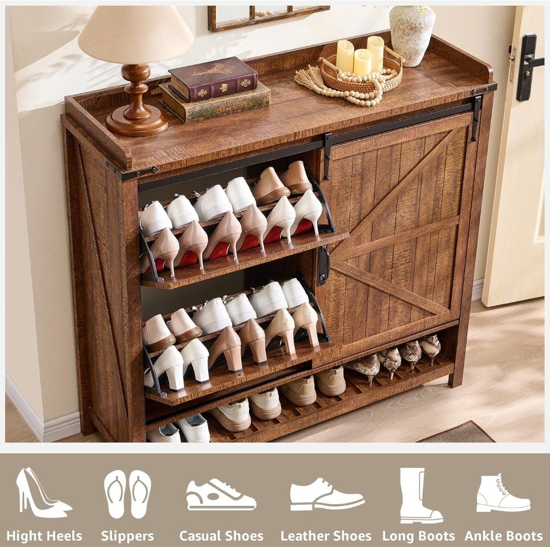 New rustic wooden shoe storage cabinet with sliding barn door and shelves. Has 2 flip drawers for storing shoes. Measures 47.2''W x 15.6''D x 45''H. Box is heavy and needs to be assembled. Great for entryway or living room. 1st pic is the one I assembled. I bought 2 and decided I only need 1.