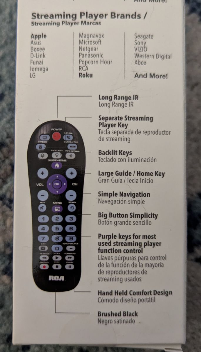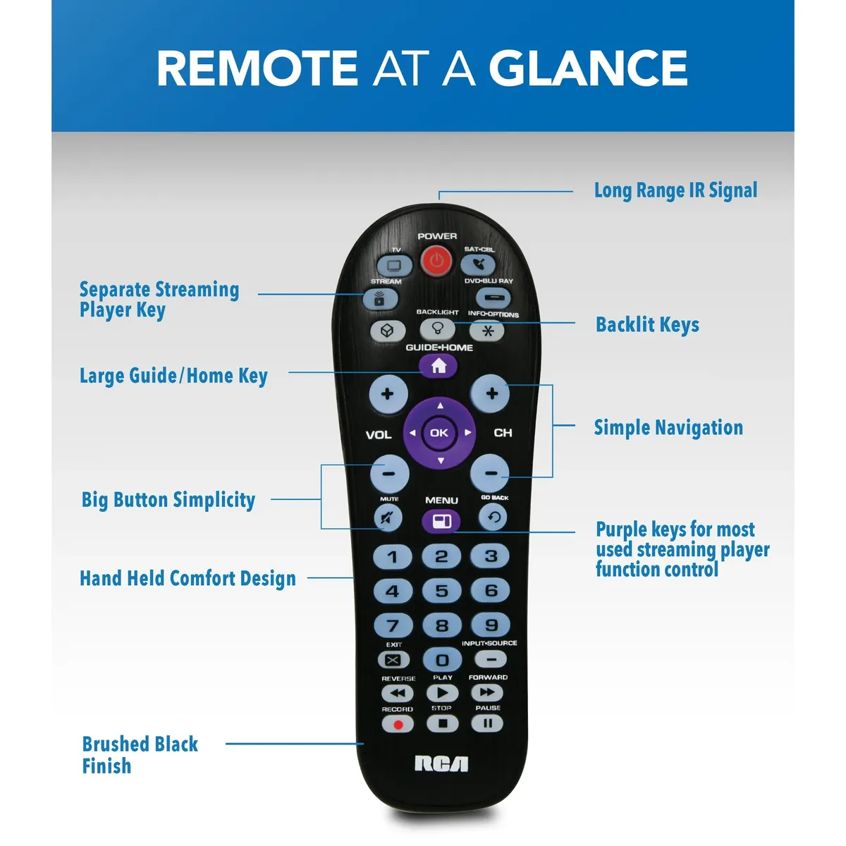 Broad Device: Controls up to four devices, including televisions, streaming players, DVD/Blu-ray players, and cable/satellite boxes.