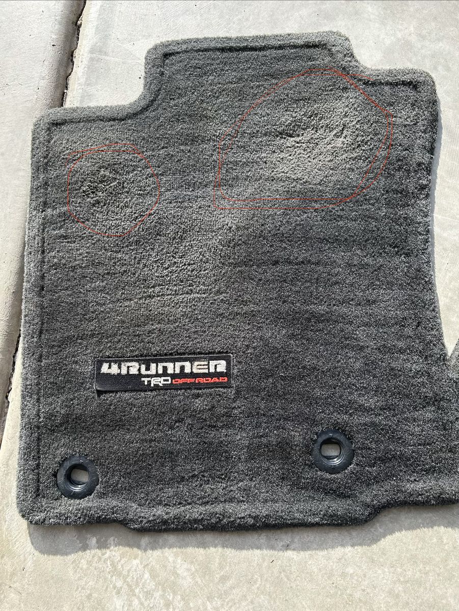 VenmoFront driver and passenger floor mats for a 5th gen 4Runner. Drivers side mat has 2 areas that aren’t as nice as the rest. The solo photo is after I tried to clean it up. It still has some sticky on the small spot of the left but it looks much better. Passenger mat looks great. Asking $20, open to offers