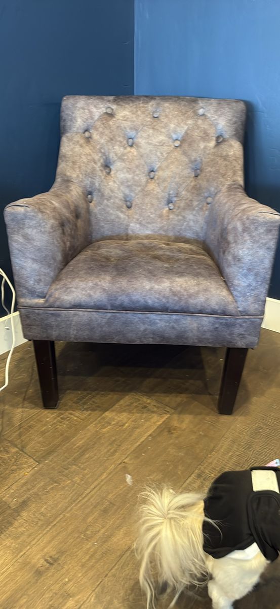 Velvet like material. Bought at RC Willy for a couple hundred two years ago. Great shape, no spills or scratches. Very slight wobble but not noticeable. For those who might use it as a functional chair, heavier people may feel a little squished. I fit in it fine and I have a large frame. Moving/downsizing. See my other ads.