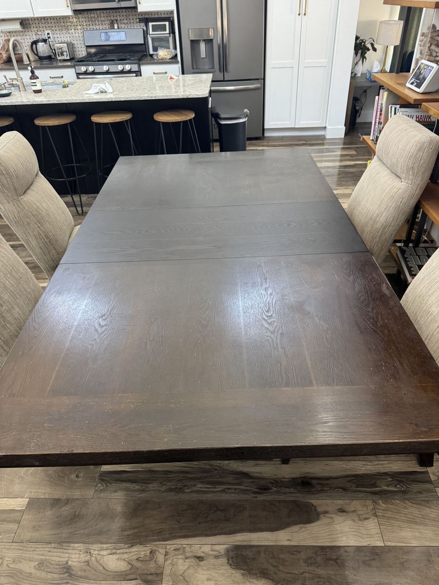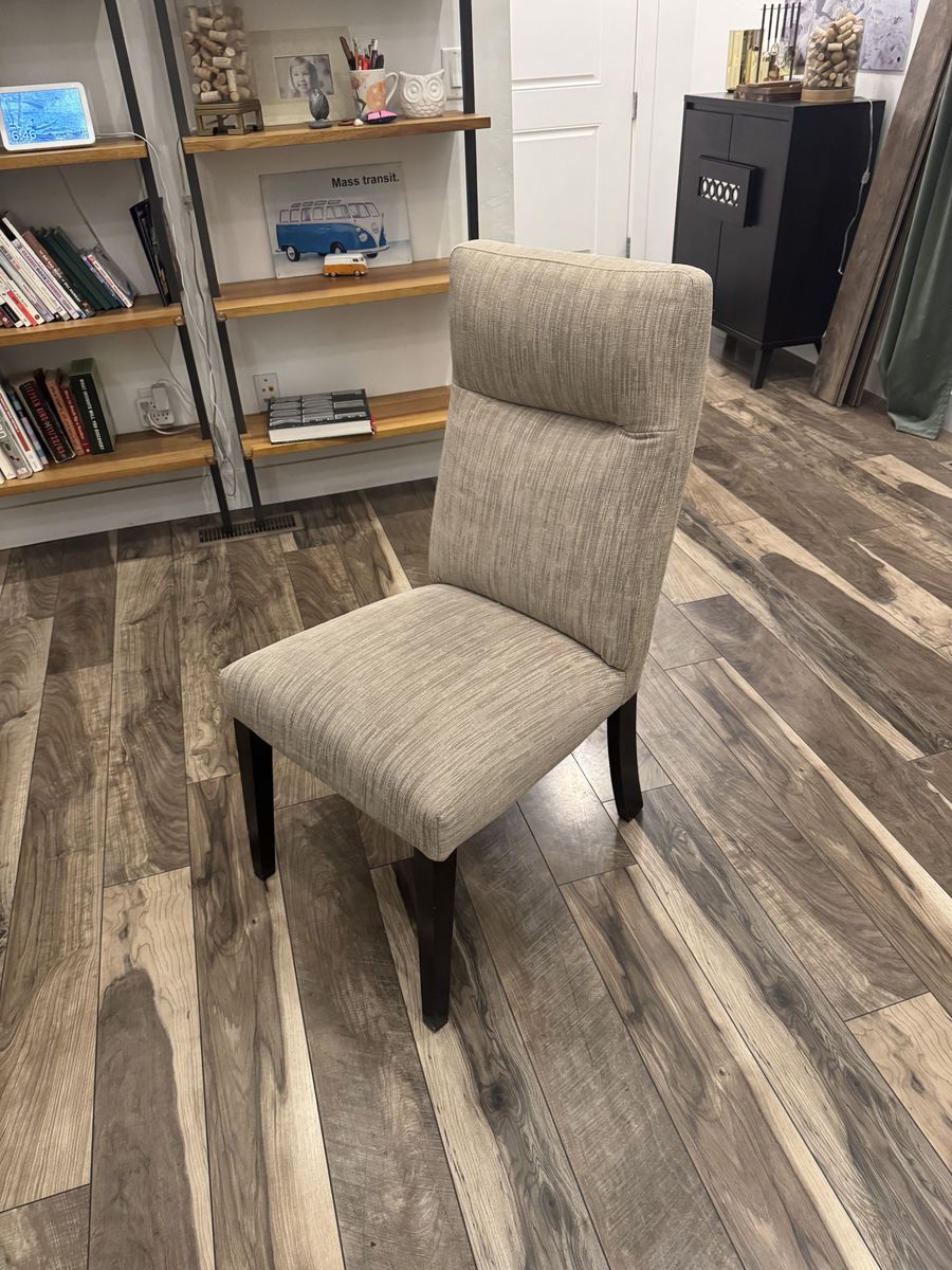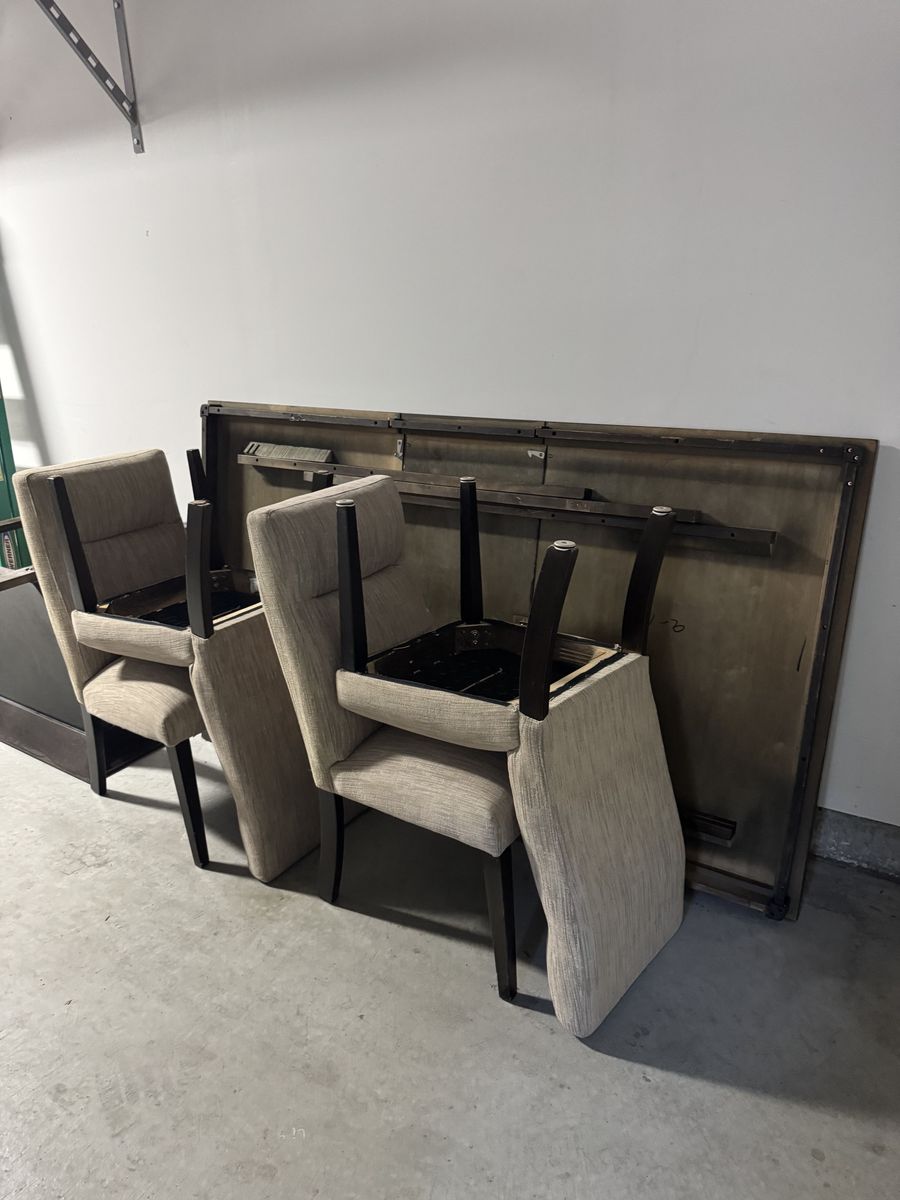 This set is sturdy, heavy, and well-built with a rich dark wood finish and clean, neutral fabric chairs that work with almost any décor. No stains, tears, or significant scratches. The fabric is clean and the table surface is in great shape.