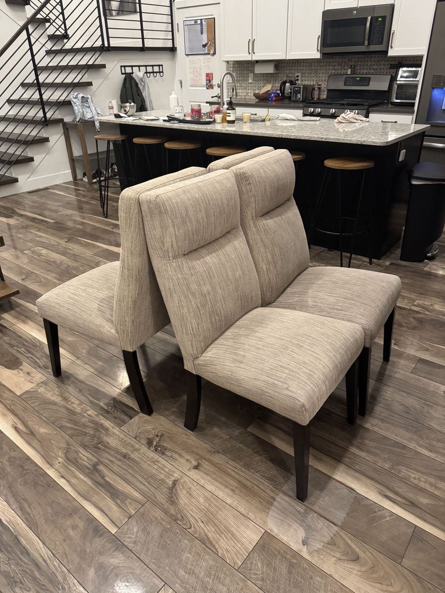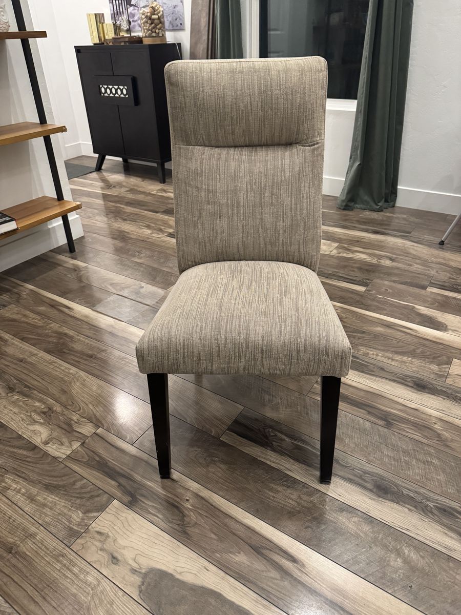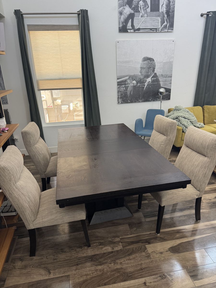 This set is sturdy, heavy, and well-built with a rich dark wood finish and clean, neutral fabric chairs that work with almost any décor. No stains, tears, or significant scratches. The fabric is clean and the table surface is in great shape.