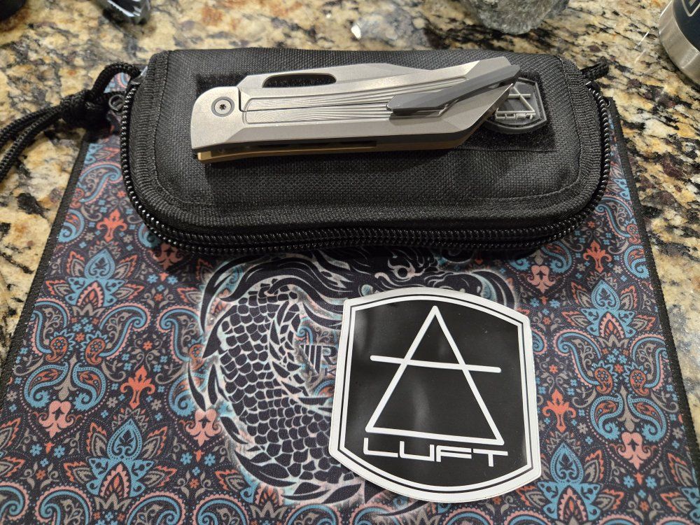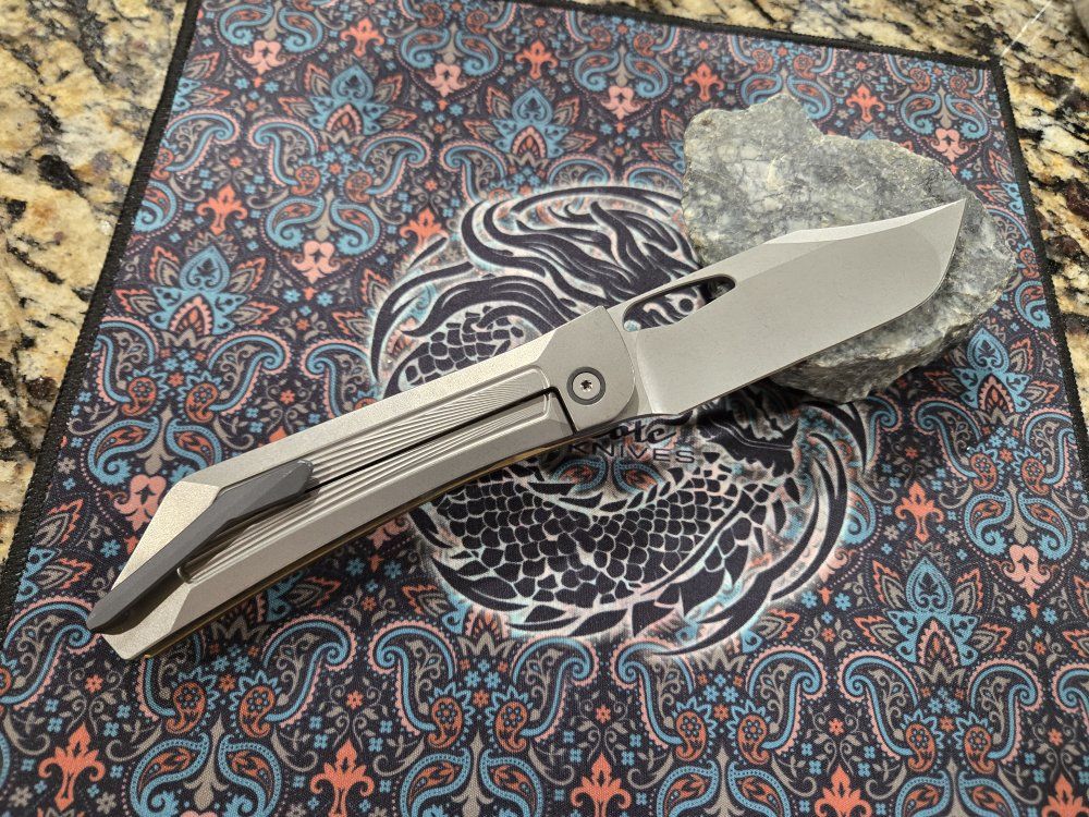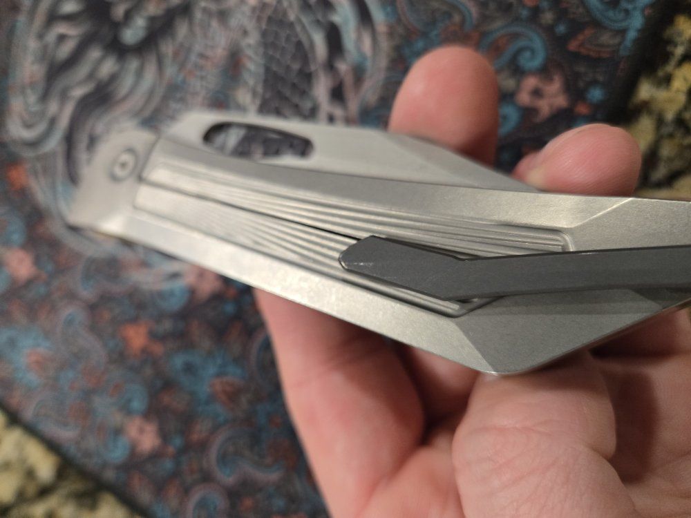 PayPalBrass and titanium handle, S90V blade, zirxonium clip and pivot collars. Second owner, never carried or cut by me. Looks to have factory edge, extremely smooth action. Slight wear on clip. Comes with soft case and sticker.