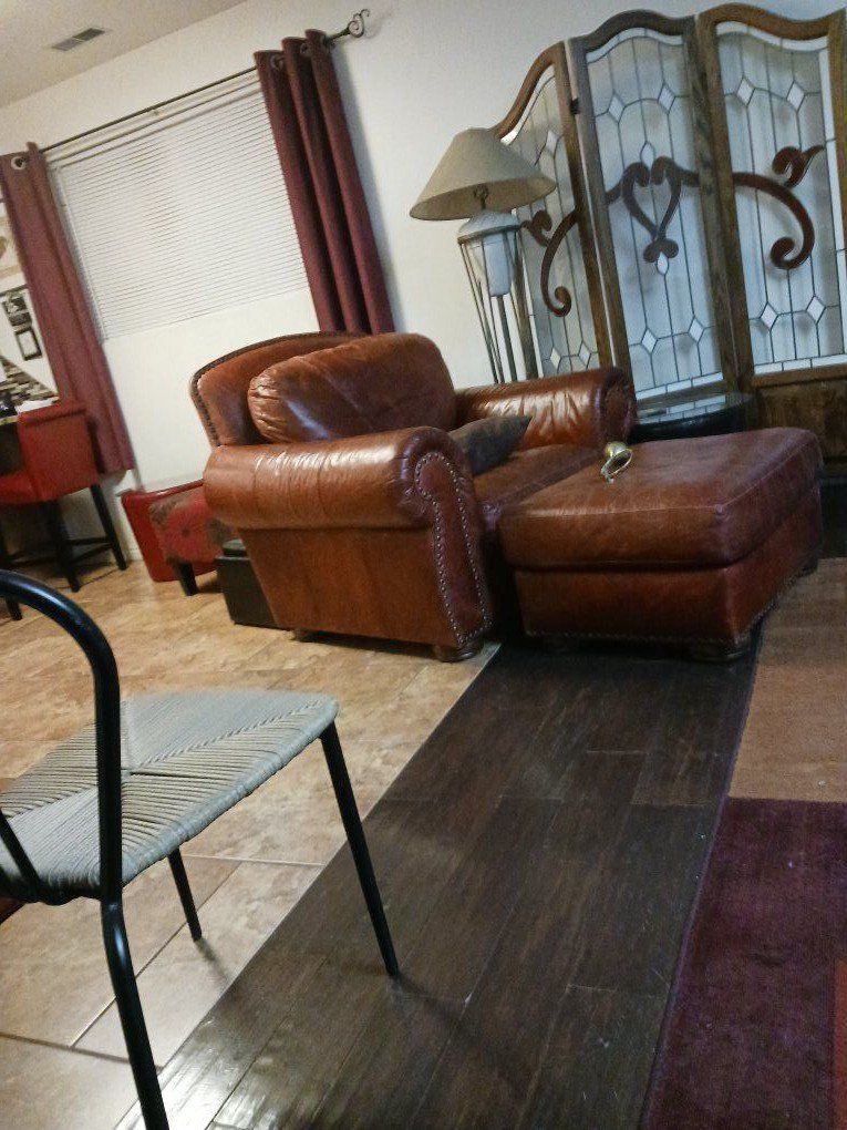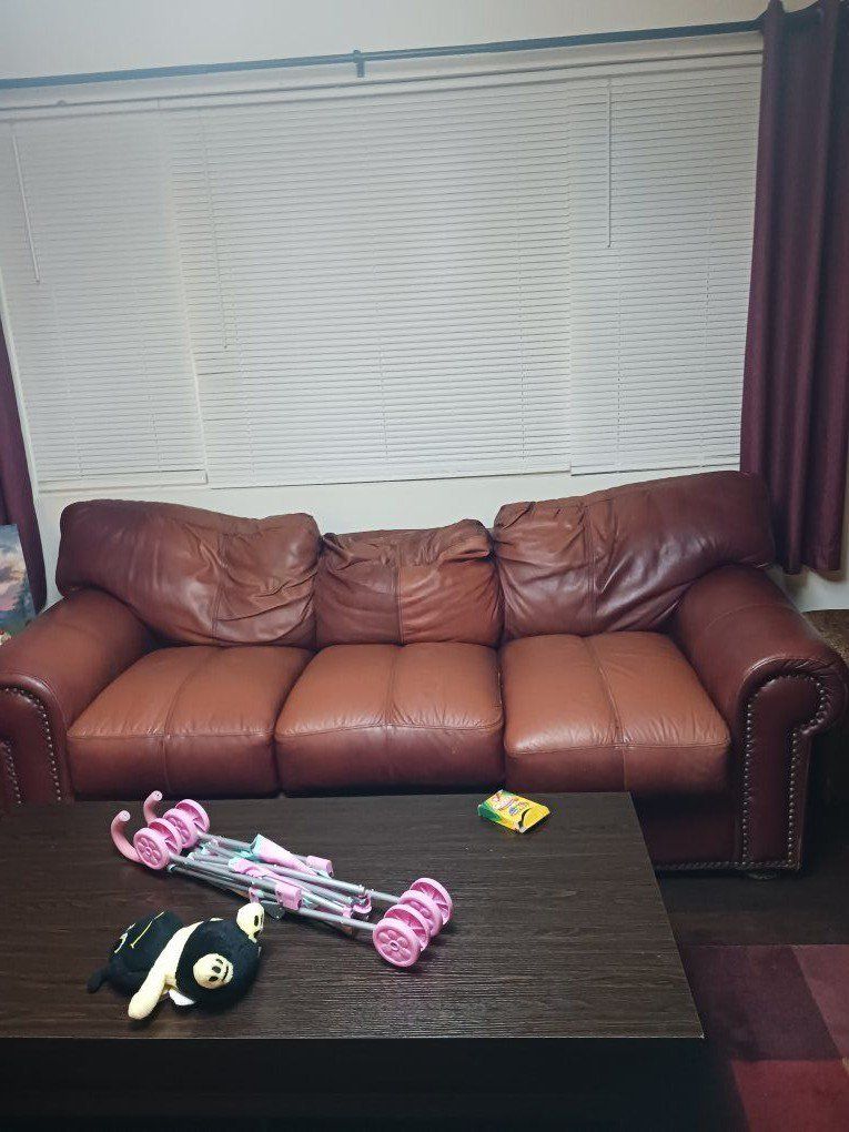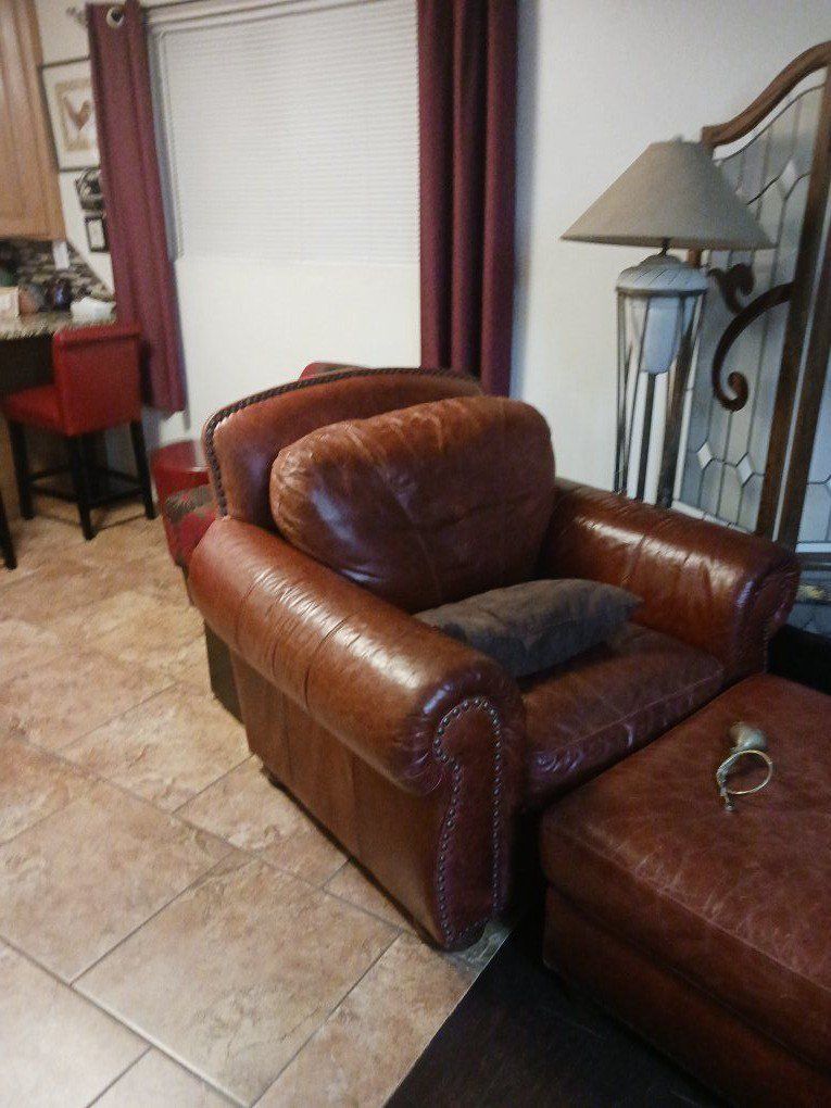 VenmoLeather couch and oversized chair and ottoman. No rips or tears but some wearing on top frame. Need leather polished. 100 for all. See in Roy. Moving kids in and need room. No smoking, pet friendly. Chair is 46 inches deep, 39 inches wide and 36 inches tall. Ottoman is 23 X 29 and 16 inches tall. Couch is 36 deep 82 long and 36 tall.