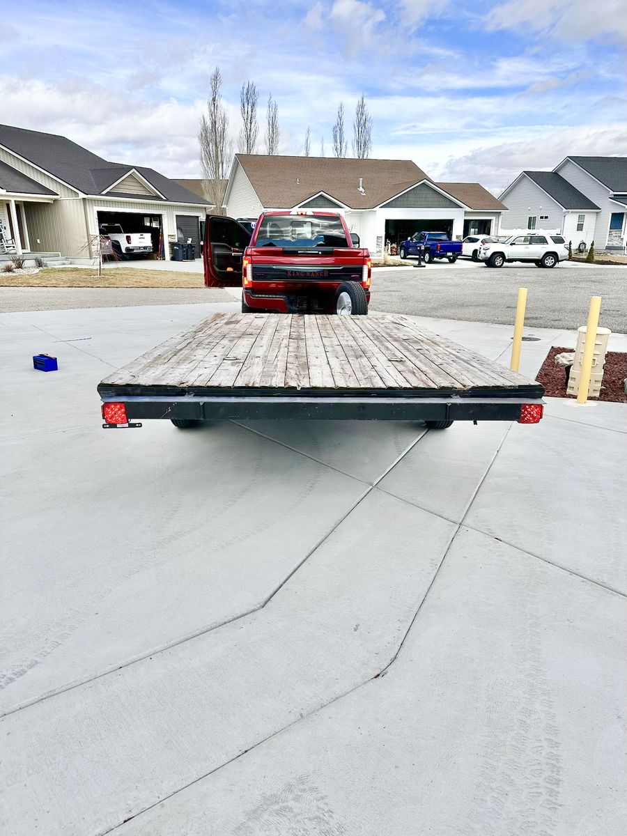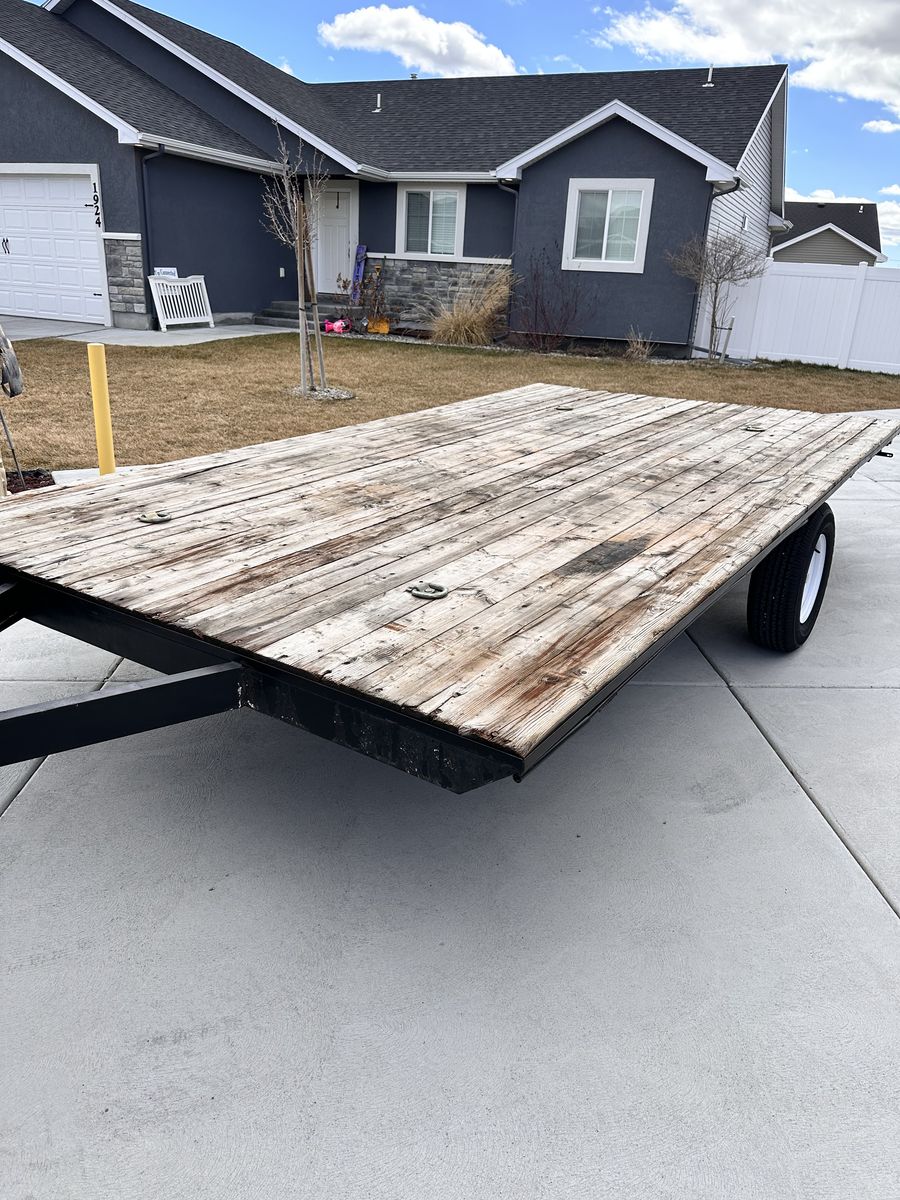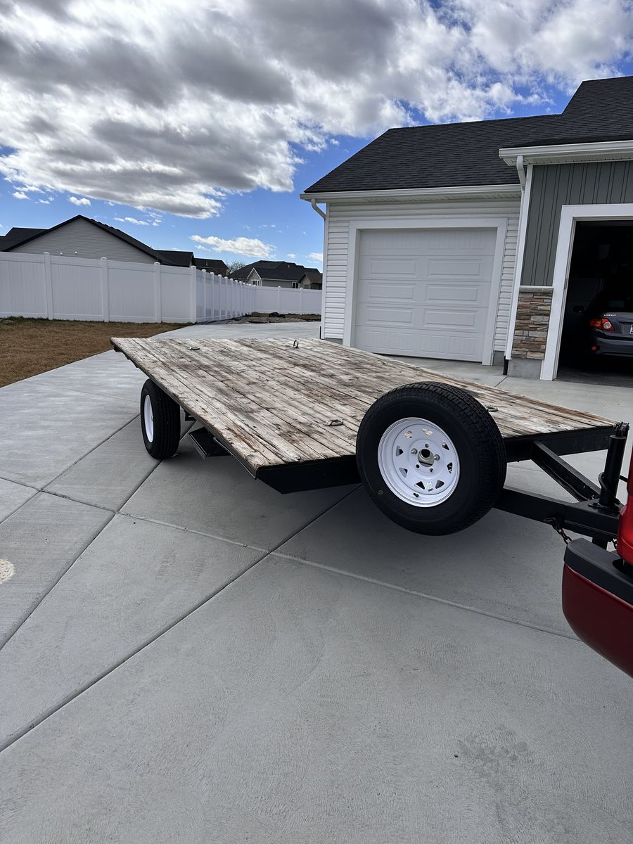 Nice Deck over utility/UTV/ATV flat bed trailer •Ready to work •Single Axle, rating is 3,500 lbs. •Center rise axle TONS of ground clearance •Bearings serviced 3/7/26 •Brand new axle seals •All tires including spare are brand new •Brand new lights and all new wiring •Deck is in great condition •Located in Idaho falls. •Measurements in photos • Will not respond to is this available, if the ad is up it’s available.