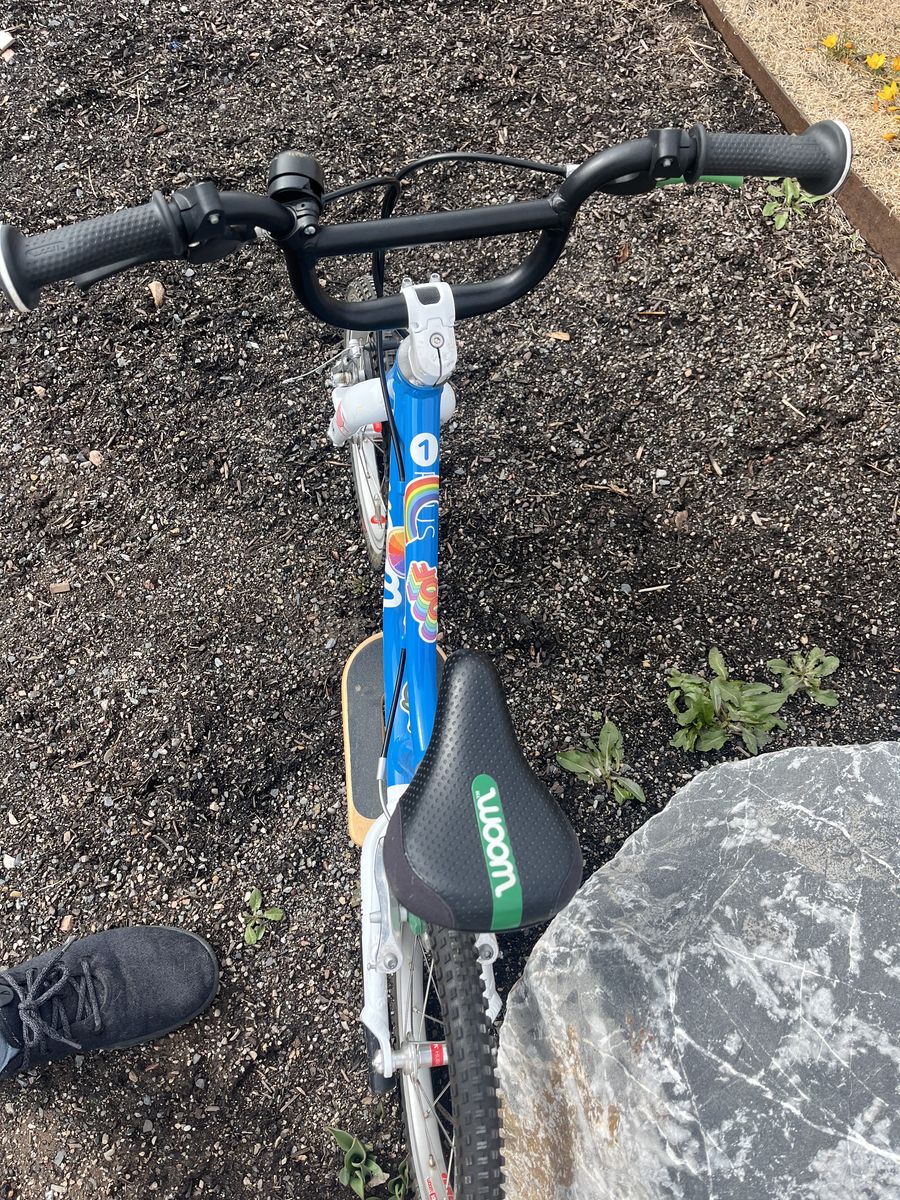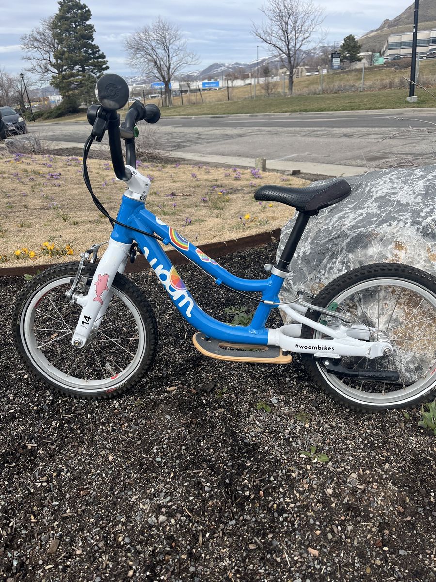 14 inch blue Woom balance bike with surfboard.