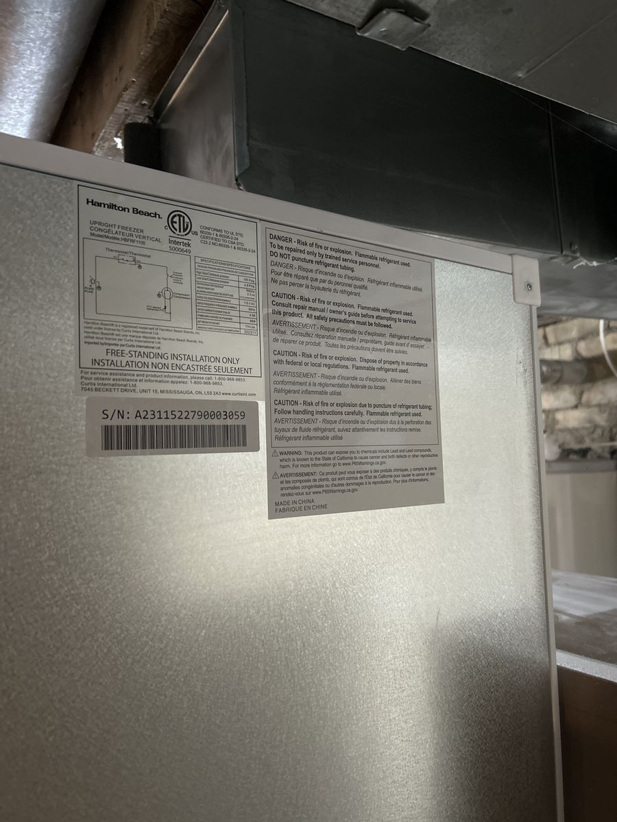 VenmoUpright freezer – Hamilton Beach. Garage ready, lightly used - has been in a basement. Drawers for storage. Purchased from Costco about a year and a half ago.