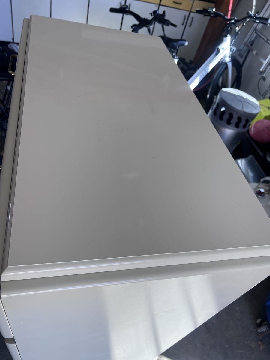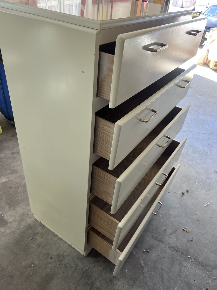 VenmoI bought this as a 5 piece set and sadly I don’t have room for this fella. He’s a cool, vibing, ivory beige color with gold accents and handles. This would be a cinch to repaint, all it would need is a light scuff sanding and a fresh coat and voila! All the drawers pull out smoothly.