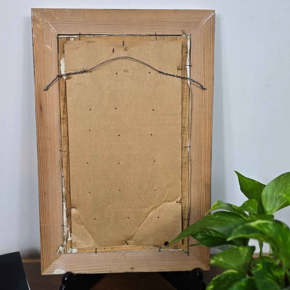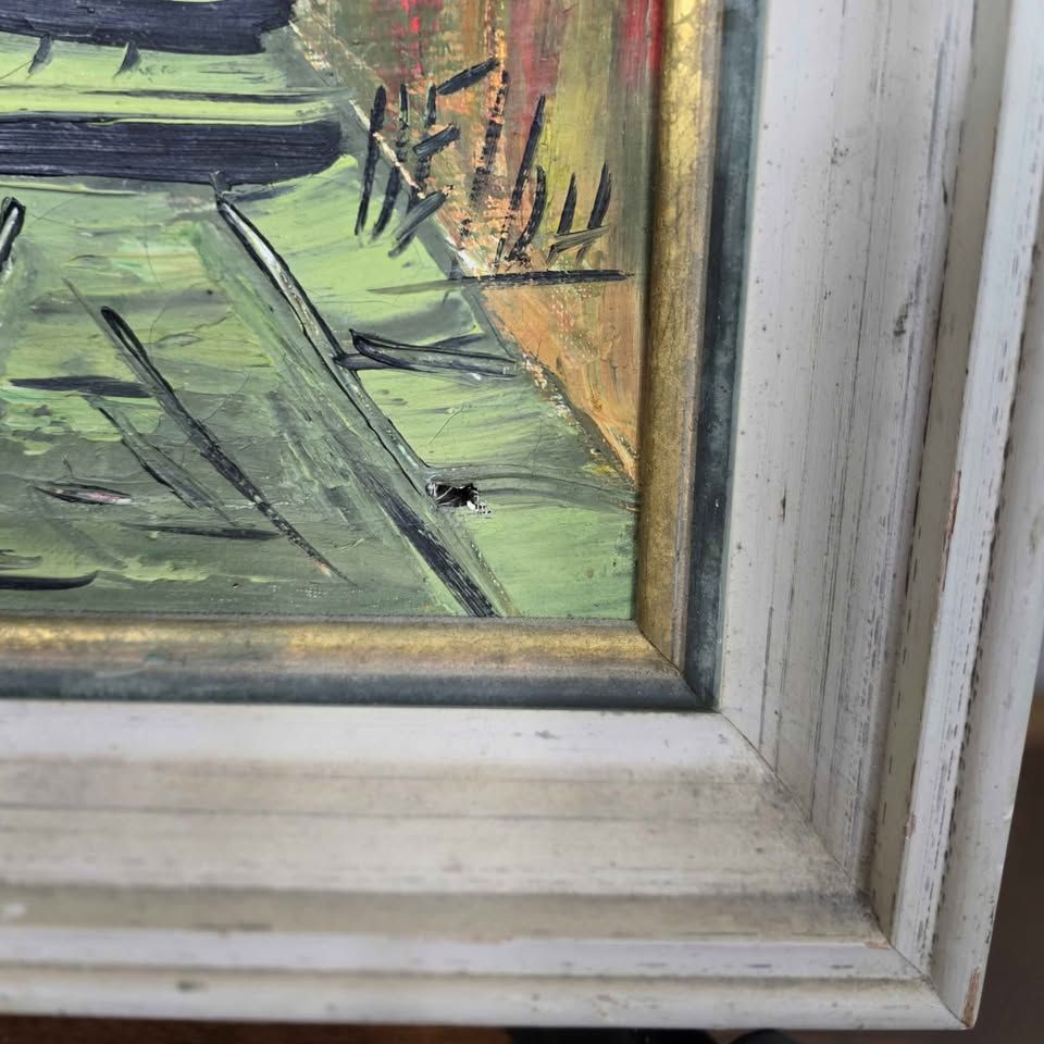 VenmoMid century framed street scene painting with artist signature (unknown). Classic European-style composition. Back is covered with cardboard. Small hole under signature (see photo). Great vintage décor piece with warm tones and character. Frame measures approx. 13" wide x 19.5" high. Downsizing and priced to move.