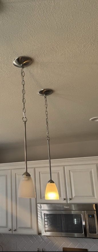 Venmo3 pendant lights over kitchen island. Frosted glass.