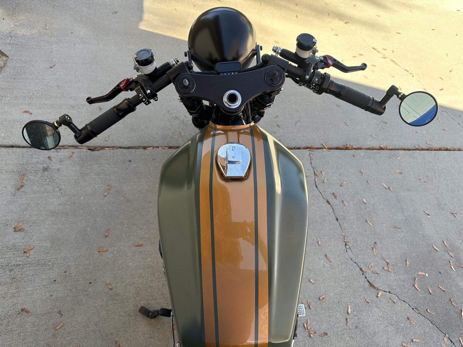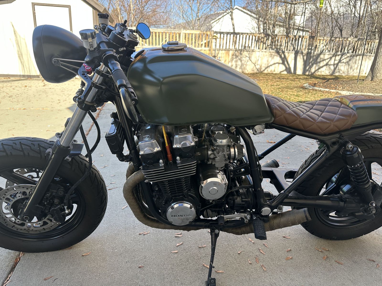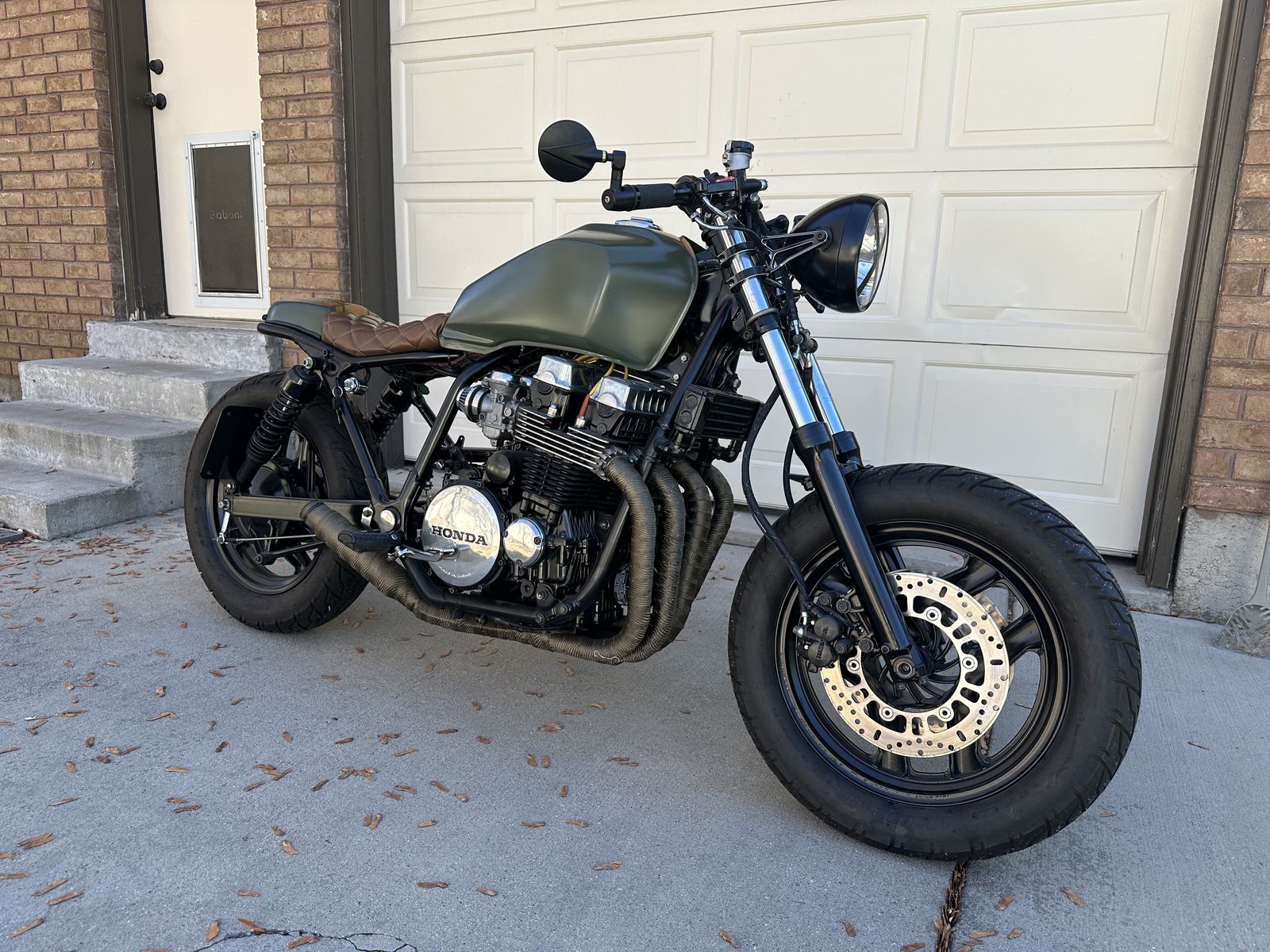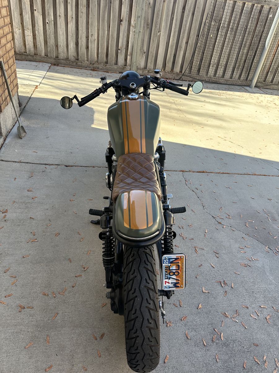 The bike was stripped down and rebuilt with a clean cafe racer style. The frame and wheels were powder coated black, and the bike features a custom army green and orange paint scheme that really stands out.