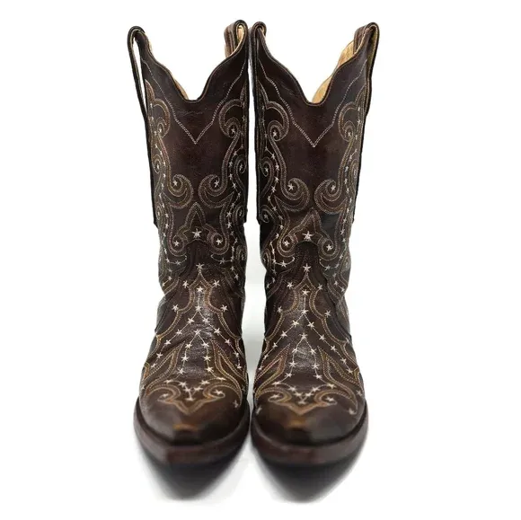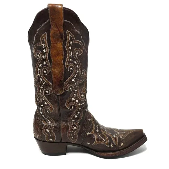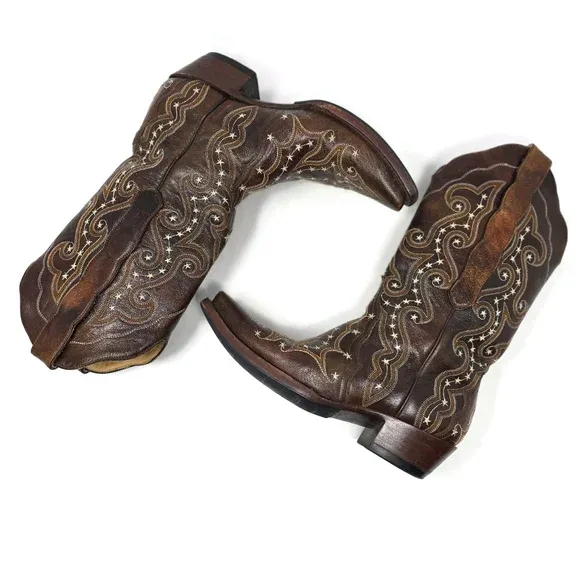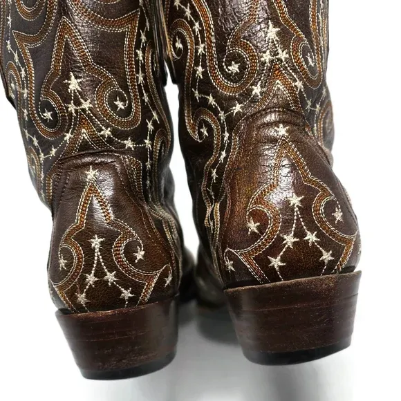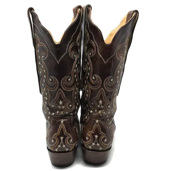 Swirling embroidery with stars throughout Beautiful condition Snip toe Shaft 11" Heel 1.5" Length from heel to tip of toe 10" Made in Mexico