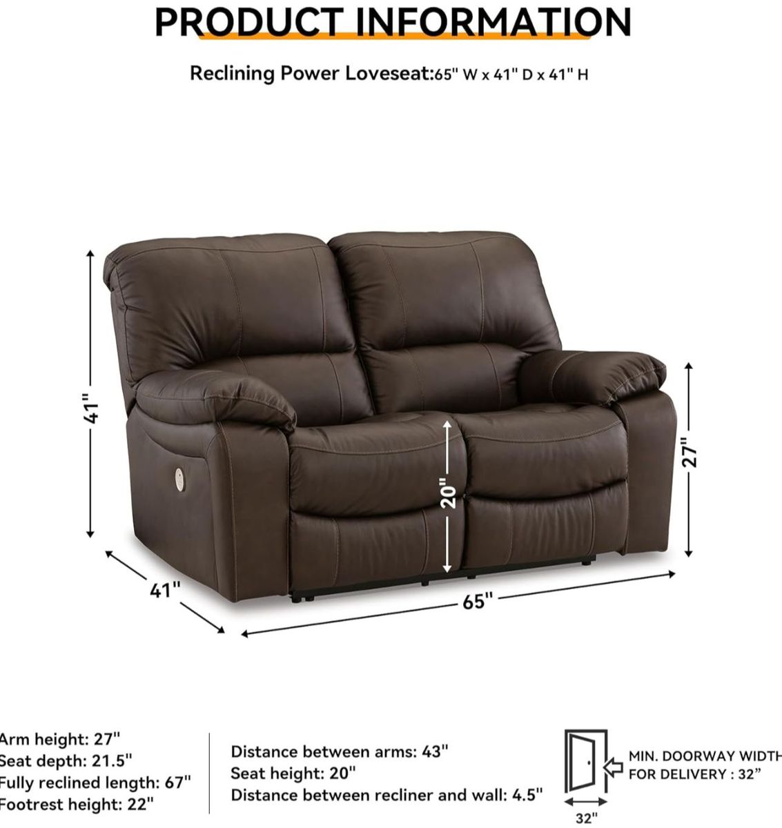 This practical power reclining loveseat balances contemporary character and irresistible comfort; Width: 65 (165.1 cm); Height: 41 (104.14 cm); Depth: 41 (104.14 cm). One-touch power control with adjustable positions and zero-draw USB port; Zero-draw technology only consumes power when the USB receptacle is in use; Zero-gravity mechanism allows optimum reclining comfort with infinite reclining positions at the touch of a button; Corner-blocked frame with metal reinforced seat; Attached cushions; High-quality foam cushions wrapped in poly fiber; 100% top grain leather covers inside areas such as the back, seat and arm cushions; skillfully matched faux leather covers the remaining areas.