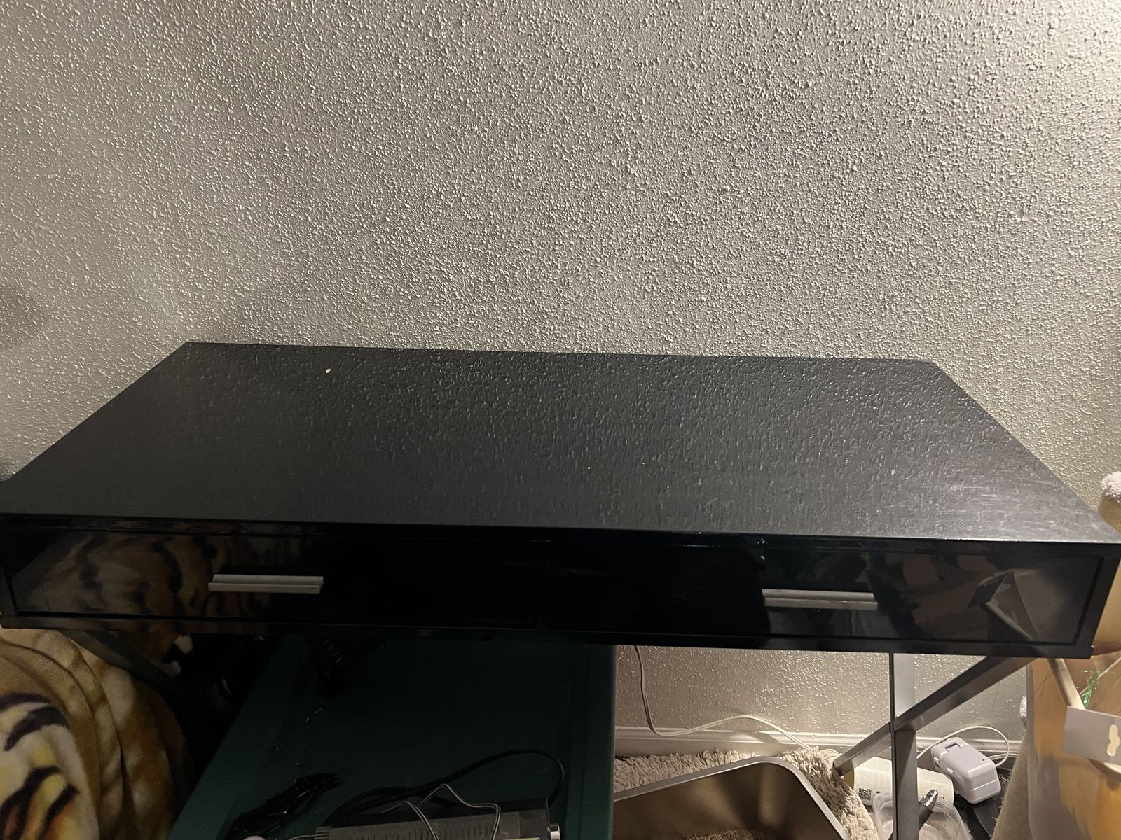 ApplePaySleek black desk with two drawers. Drawers have silver handles. Good for small spaces or as a console table. Just don’t need anymore and moving so need gone.