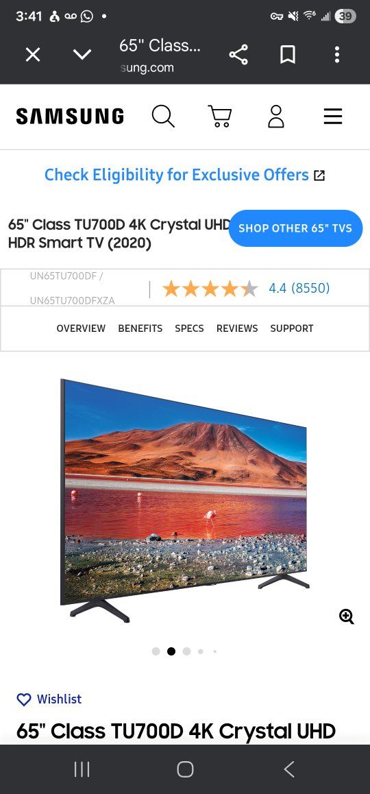 Venmo65" Samsung Crystal UHD 4K Smart TV class UN65TU700DFXZA, in excellent condition. Incudes remote. It has been an excellent TV, used very lightly, and in like-new condition.