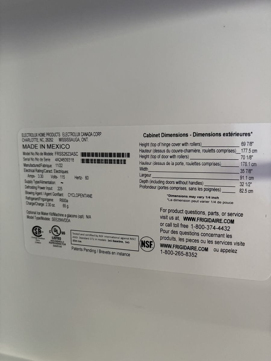 ApplePayFrigidaire side-by-side refrigerator (Model FRSS2623ASC). Purchased new about 3 years ago.