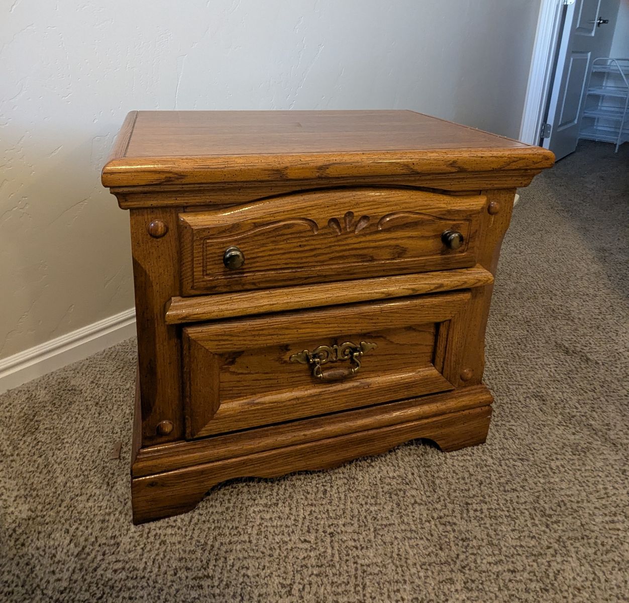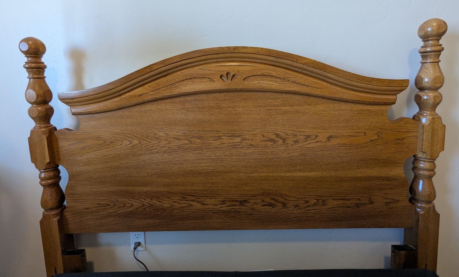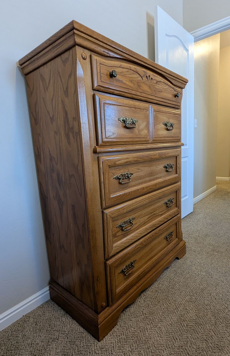 ZelleFour piece bedroom set. 8 drawer dresser (64"W x 18"D x 76.5'H, main top 31"H), 5 drawer chest of drawers (38"W x 18"D x 53"H), Queen/Full Headboard (64"W x 51.5"H x 3"D), 2 drawer side table (26"W x 16"D x 23"H). Older, but decent condition. In the tall chest of drawers a couple of drawers have track issues. Must have truck and manpower to move yourself. $350 or make an offer.