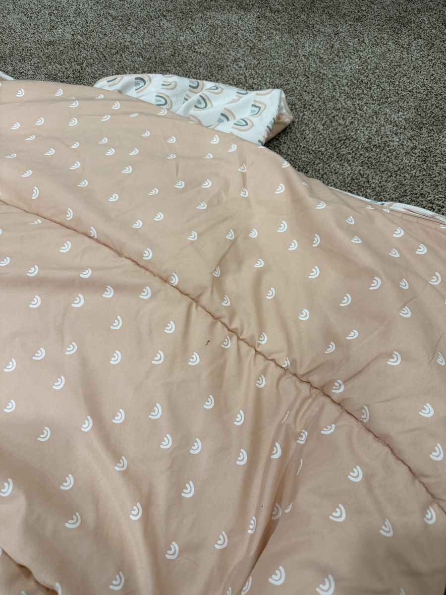 Has 2 shams and 2 cases. Small stain on top and seam coming undone at bottom. Mar5