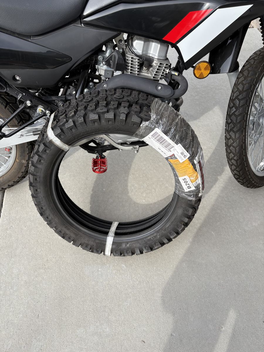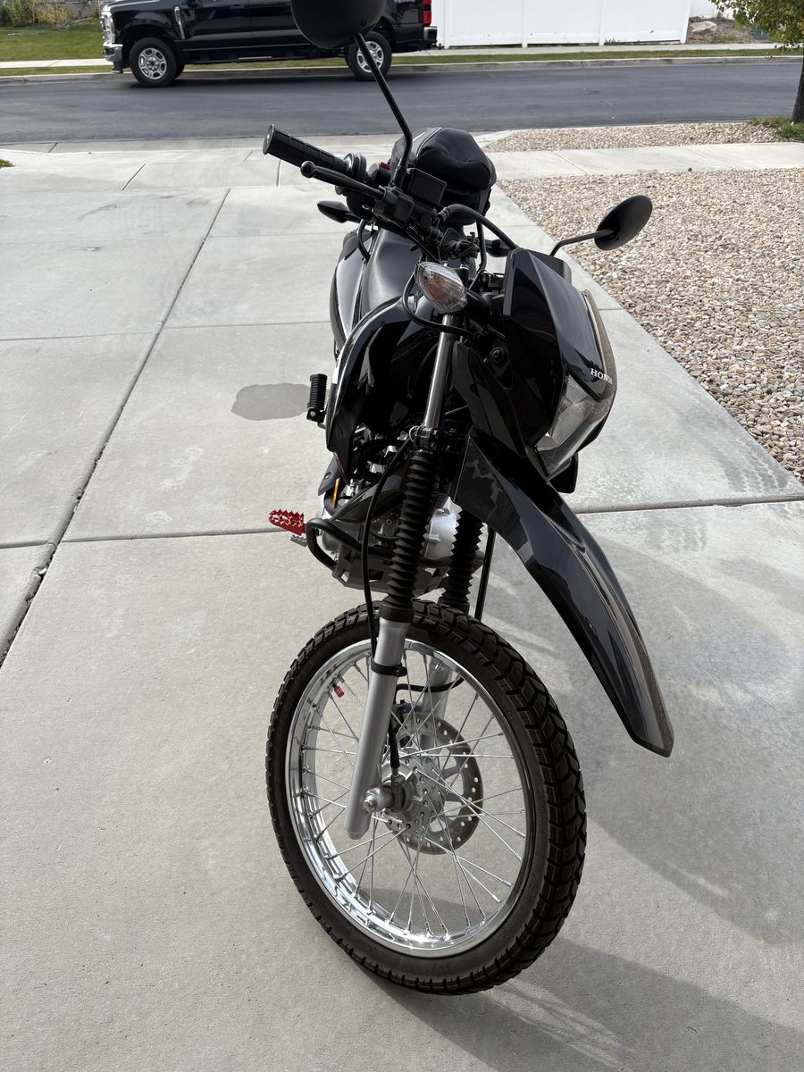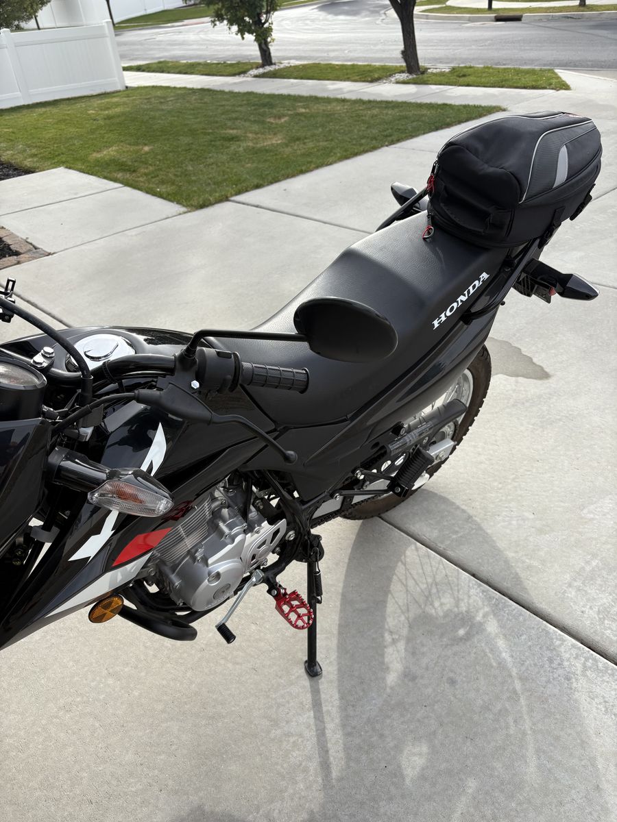 I have a 2023 Honda XR150L dual sport motorcycle for sale. I bought it used from a private seller with 67 miles on it about a year ago. It now has 165 miles on it. Engine probably isn't even 100% broken in. It has been so fun to ride! Mainly ridden around the neighborhood and on mountain paved roads. It's never been off-road on a trail. Since having it, I've added an engine skid plate, new foot pegs, a cell phone holder, a cargo bag on the back of the seat, and I have a brand new set of nobby tires for it. I never got around to changing them out. They are Shinko brand tires. Bike still has original tires in excellent shape still on it of course. Black with red and white sticker graphics. Title in hand. Firm on price. I will deliver if location is reasonable. 149 cc air cooled single cylinder engine. SOHC two valve Valve Train. 5 speed Transmission, manual. Electric start. Front and rear suspension. Front disc break. Rear drum break. seat height 32.8 inches. 9.6 in ground clearanc. 2.8 gallon fuel tank. Gets about 90 miles a gallon. 282 pound curb weight. Rear cargo rack.