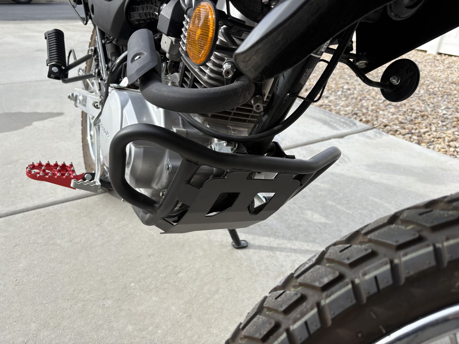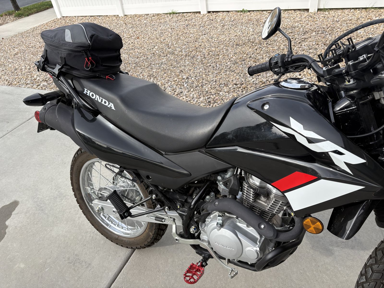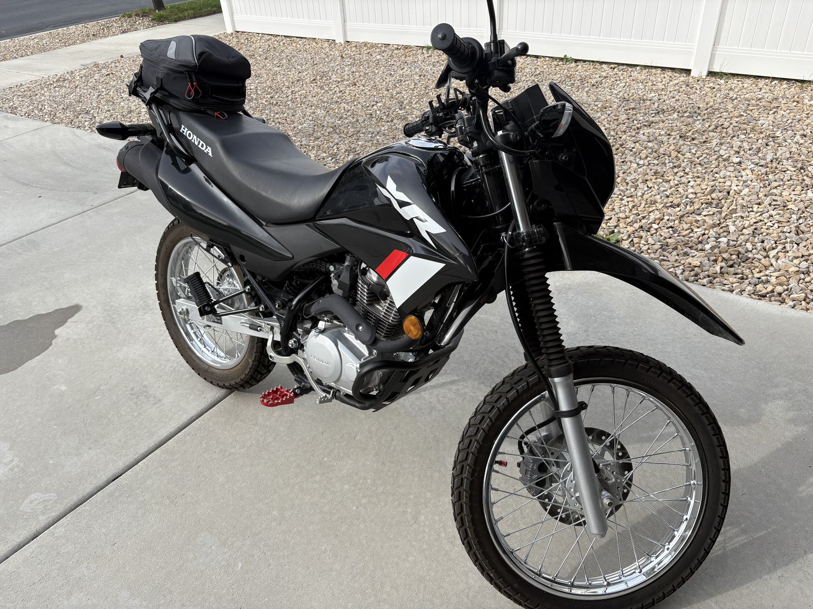I have a 2023 Honda XR150L dual sport motorcycle for sale. I bought it used from a private seller with 67 miles on it about a year ago. It now has 165 miles on it. Engine probably isn't even 100% broken in. It has been so fun to ride! Mainly ridden around the neighborhood and on mountain paved roads. It's never been off-road on a trail. Since having it, I've added an engine skid plate, new foot pegs, a cell phone holder, a cargo bag on the back of the seat, and I have a brand new set of nobby tires for it. I never got around to changing them out. They are Shinko brand tires. Bike still has original tires in excellent shape still on it of course. Black with red and white sticker graphics. Title in hand. Firm on price. I will deliver if location is reasonable. 149 cc air cooled single cylinder engine. SOHC two valve Valve Train. 5 speed Transmission, manual. Electric start. Front and rear suspension. Front disc break. Rear drum break. seat height 32.8 inches. 9.6 in ground clearanc. 2.8 gallon fuel tank. Gets about 90 miles a gallon. 282 pound curb weight. Rear cargo rack.