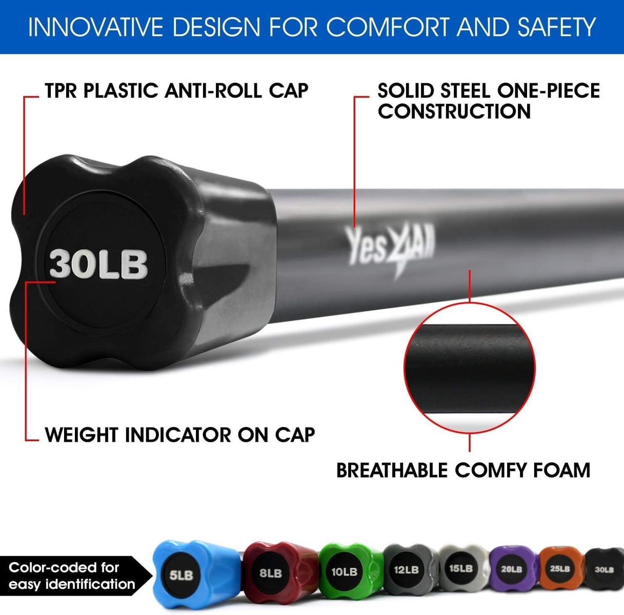 Yes4All Total Body Workout Weighted Bar, Resistance Band Bar, Racks for Strength Training, Exercise Bar for Yoga in Home and Gym - Single/Combo