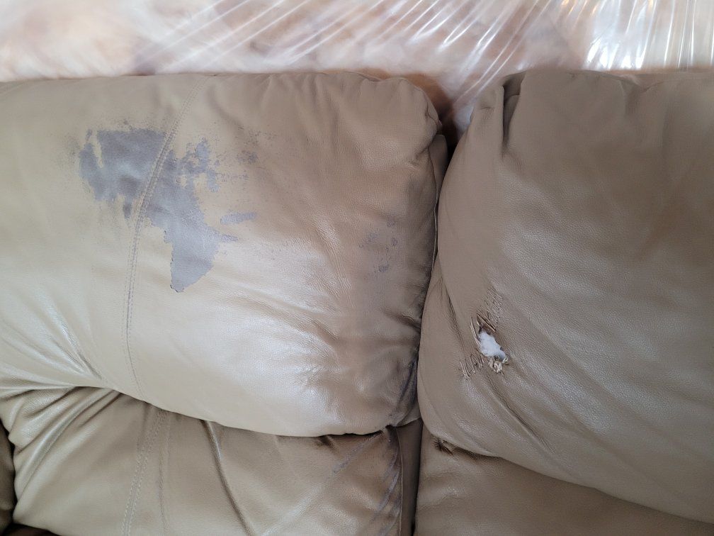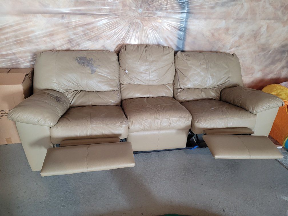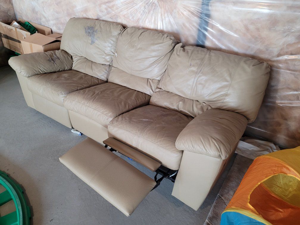 VenmoLarge fake leather couch. One side is a little crooked on the pull out foot but is still functional. Has peeling from wear and tear and a rip on the back middle seat photo included.