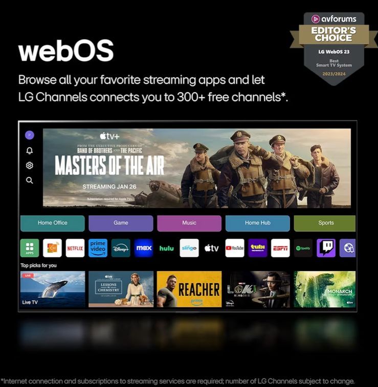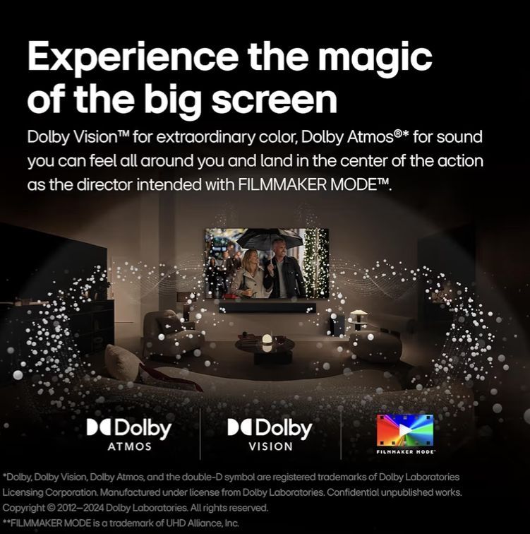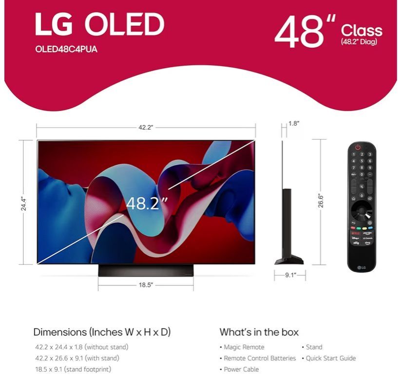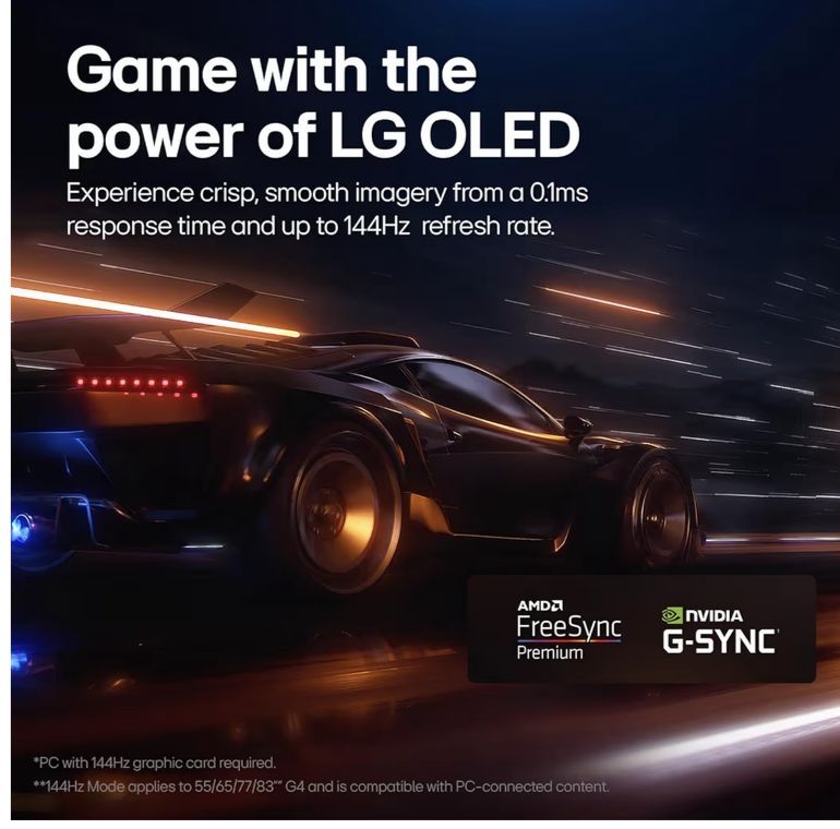 LG's signature OLED technology creates an incredible watching experience and stellar picture quality illuminated with over 8 million self-lit pixels. Take in rich and accurate colors from the brightest to darkest parts of the scene thanks to 100% Color Volume and with 100% Color Fidelity. REFRESH RATE OF 144 HZ : Enjoy crisp, smooth visuals with a 0.1ms response time and up to 144Hz refresh rate. LG OLED TVs feature NVIDIA G-Sync, AMD FreeSync Premium, and VRR for enhanced gaming quality. With four HDMI 2.1 inputs, connect all your devices effortlessly. The LG Game Dashboard and Game Optimizer provide complete control whether you game on consoles or in the cloud. DOLBY VISION, FILMMAKER AND DOLBY ATMOS: Experience the magic of the big screen right from your couch. Every LG OLED comes loaded with Dolby Vision for extraordinary color, contrast and brightness, plus Dolby Atmos for sound you can feel all around you. Land in the center of the action with FILMMAKER MODE, allowing you to see films just as the director intended. A9 AI PROCESSOR GEN7: The C4's exclusive processor is the brains behind a truly unforgettable TV experience. You'll get smooth, vivid picture no matter what you watch with AI Super Upscaling which automatically enhances picture quality whether you're watching sports, movies, or a late-night favorite. Multi View with 2 screens lets you split your screen into 2 unique views so you can watch even more than before, everything looks and sounds incredible on a LG OLED TV