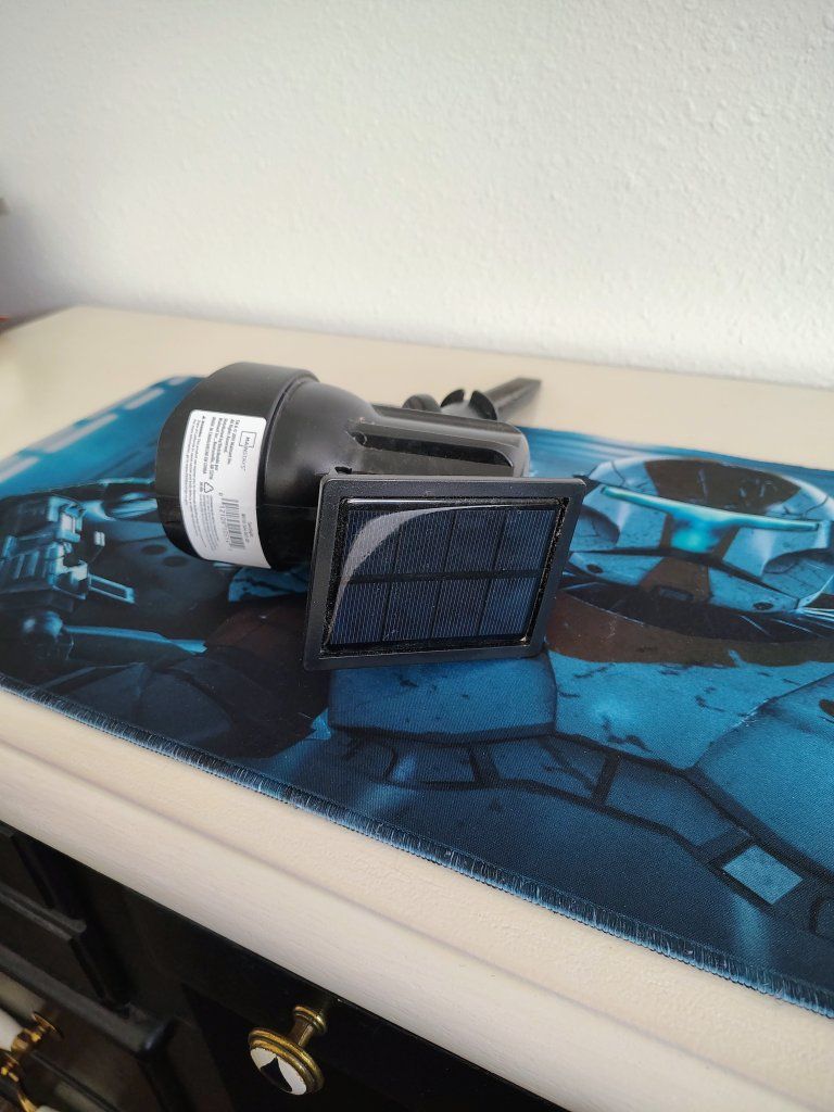 Solar powered spotlight that can be adjusted and placed in the ground.