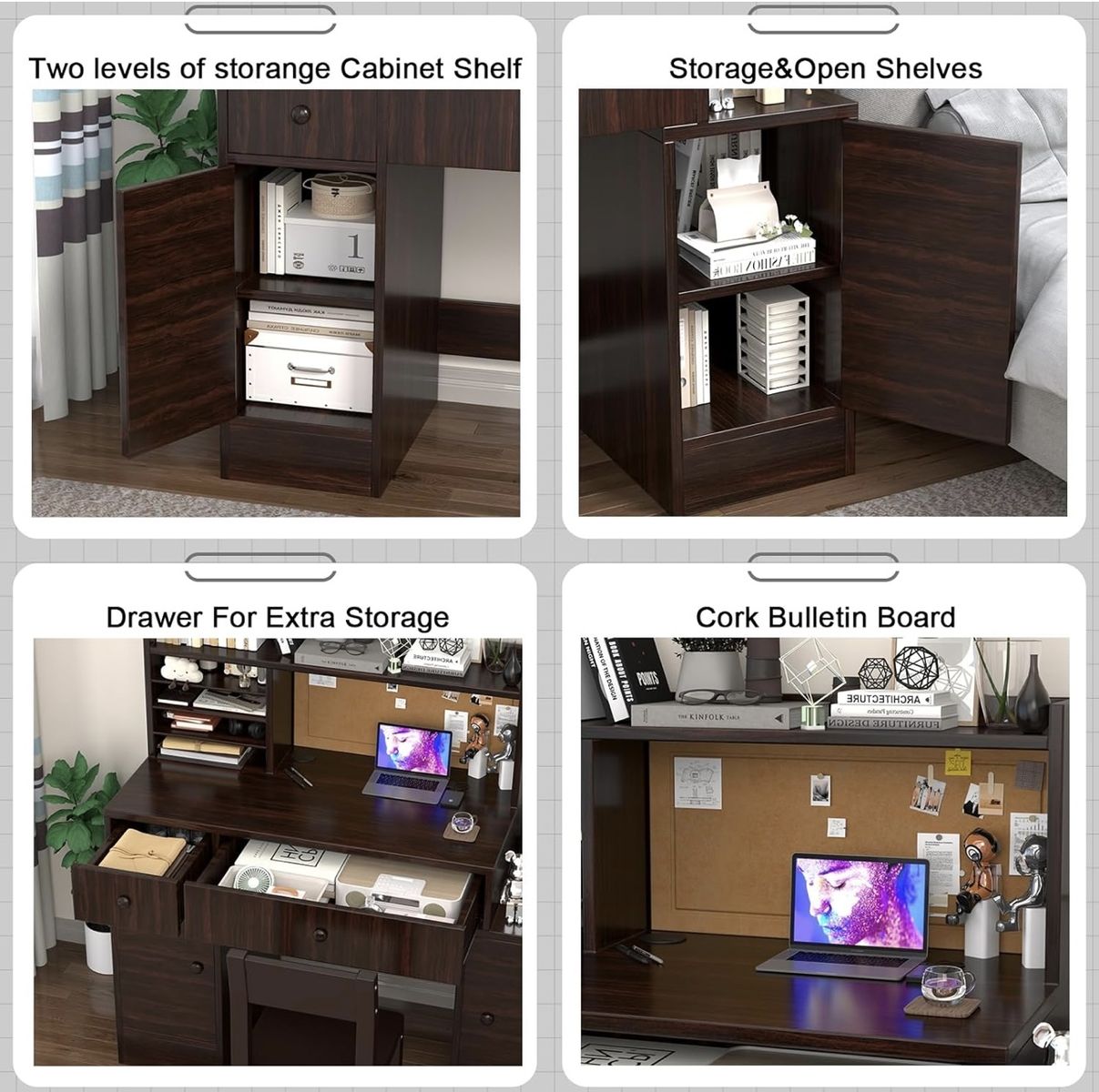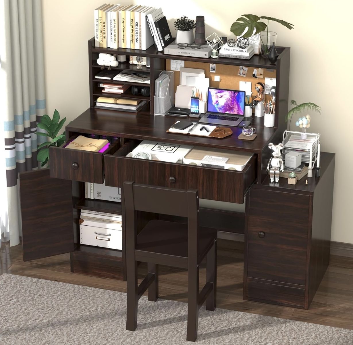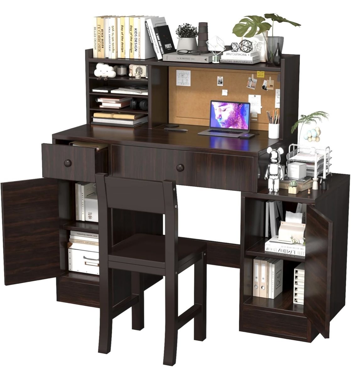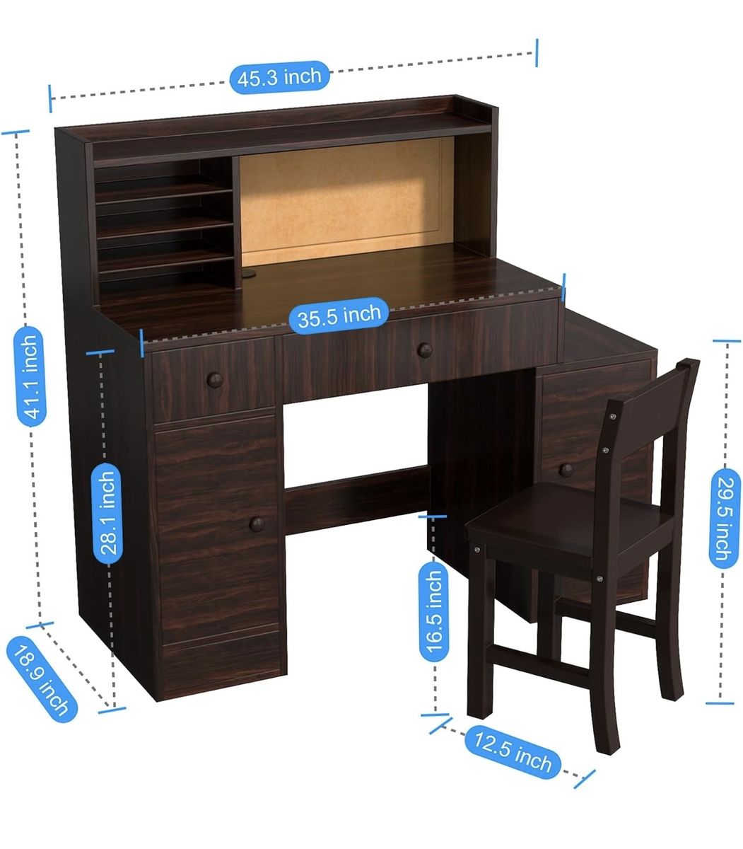 CUBBIES CORKBOARD AND MORE : This kid's desk and chair set comes with a clipboard, a cabinet, and four drawers, The desk offers you ample space to keep books, documents, and other things, suitable for adults and children.-u23UG3 SIZE & EASY TO INSTALL : The set includes a study desk and chair. Desk size: 45.3L x 18.9W x 41.1H, Chair size: 12.5W x 12.5D x 29.5H.With its simple structure and all accessories included, it ds convenient to install within a short time under the guidance of the manual provided in the package.-u23UG3 PERFECT DESK & CHAIR SET : Consisting of a writing desk and a chair, this furniture set is an ideal birthday or festival gift for your children. Not only provides you with a comfortable place to study, read, and draw but also helps you to form the good habit of organizing your things and keeping them in order.
