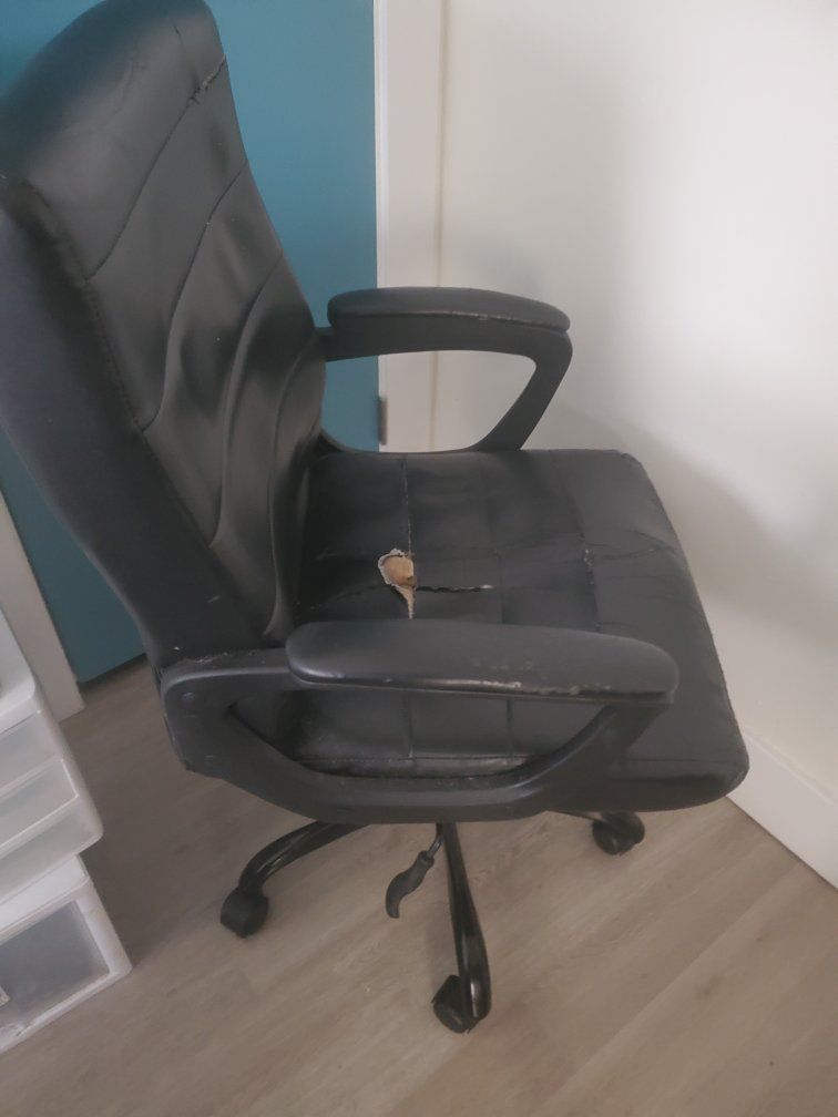 Regular office chair on wheels. some wear and tear. giving it away. first come first serve