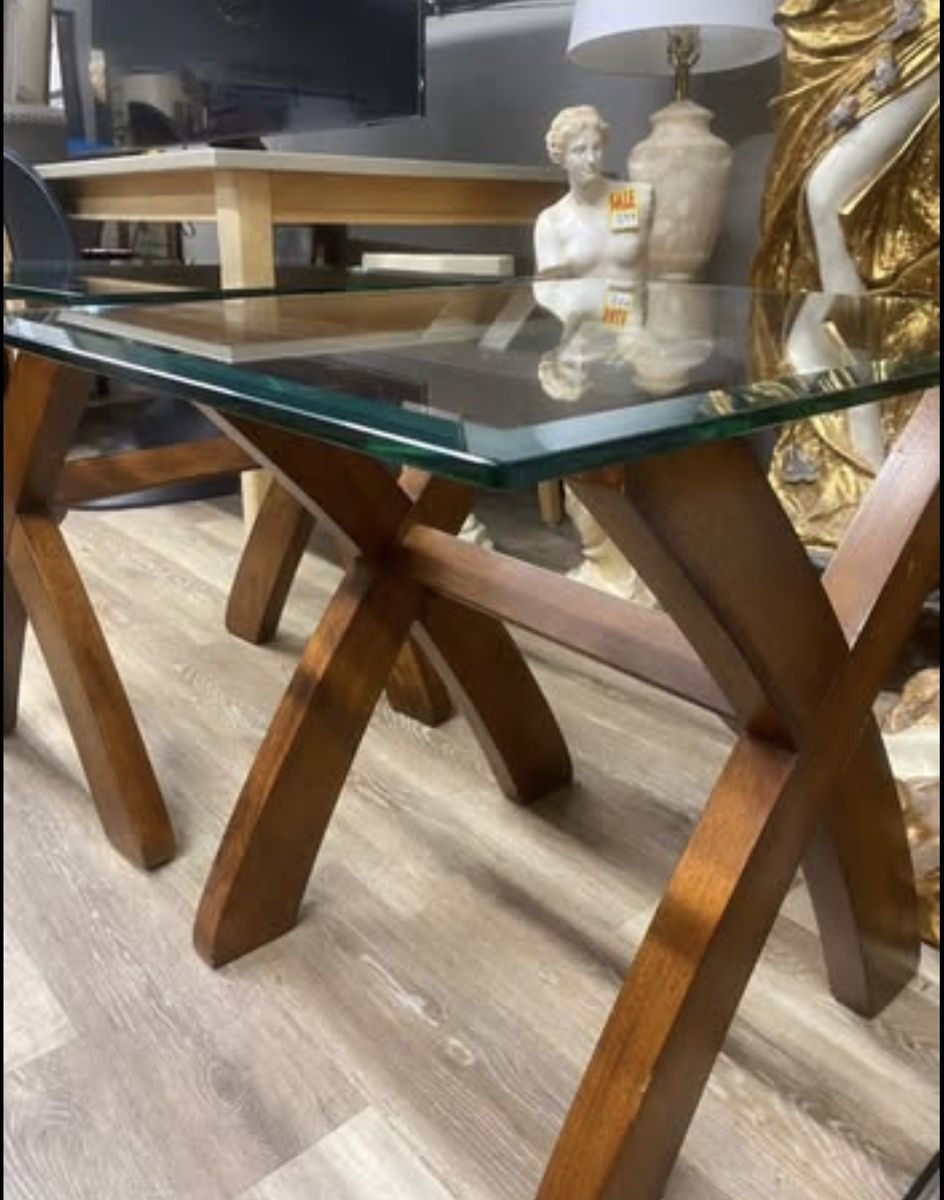 This elegant end table features a sleek glass top supported by a sturdy solid wood base with a rich dark stain. The table measures 28 inches wide, 24 inches deep, and 25 inches tall, making it a perfect addition to any living space. The unique design of the base adds a modern touch while ensuring durability and stability. Ideal for showcasing decorative items or providing a convenient surface for drinks and snacks.