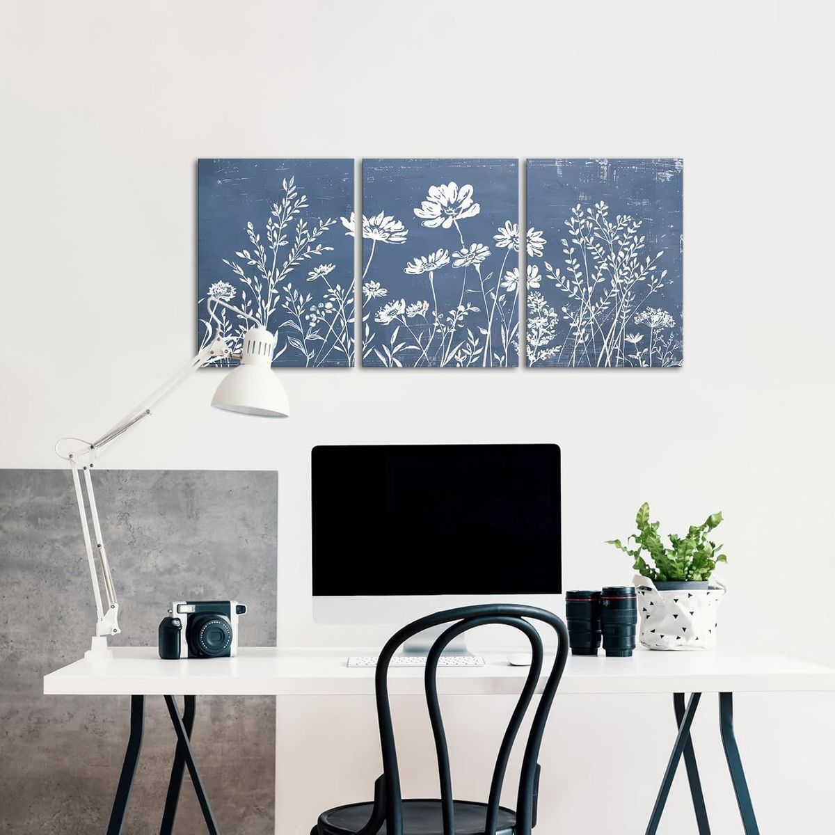 ApplePayArtmyharbor Navy Blue White Wall Art Wildflower Canvas Prints Minimalist Bathroom Decor 12 x 16 inches
