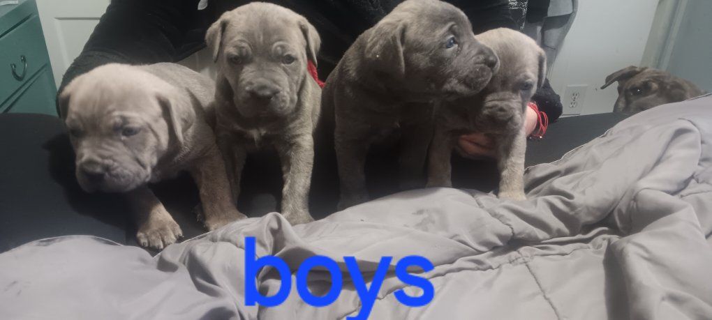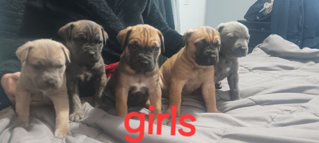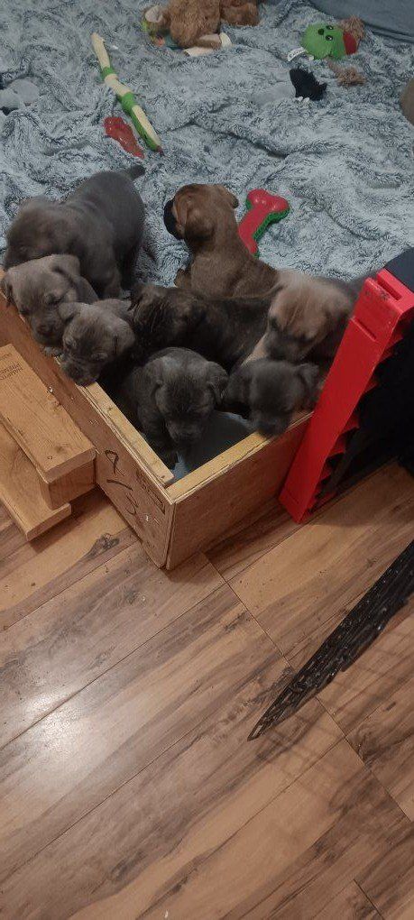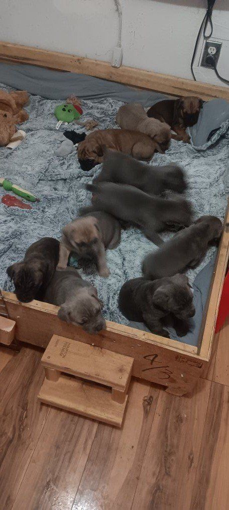 we have 9 Italian mastiff puppies five females four males they are purebred they do have their Tails cut asking $900 or best offer 5 weeks old will come with their first shot even willing to trade you can also text Brooke at 801-921-9445