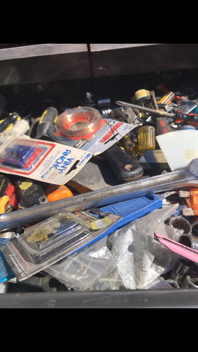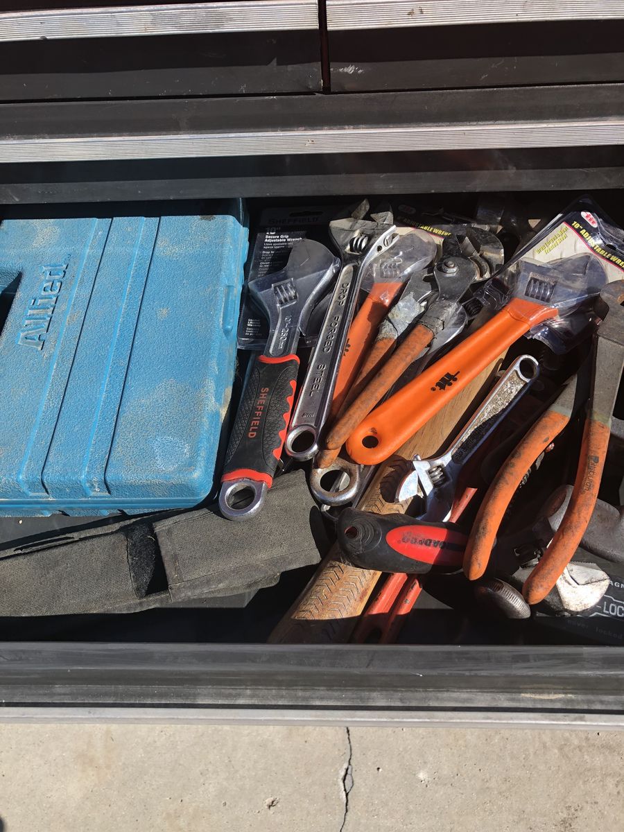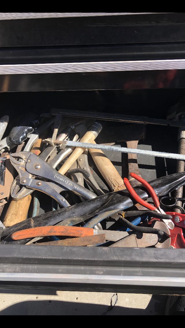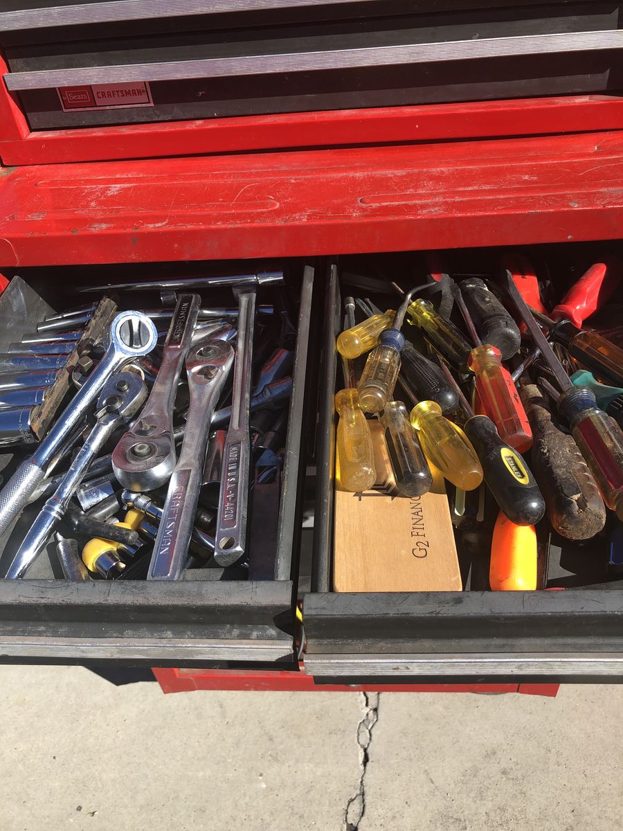 Craftsman Tool Box 12 Drawers on the top box, and 6 Drawers and a large cabinet on the bottom with a swing door, that has a set of jumper cables, and crow bar. The bottom drawers are filled with miscellaneous tools that are included. Screw drivers, sockets, wrenches, pliers, dikes, ratchets, , hack saw just about everything you can think of no key take all $260.00!!