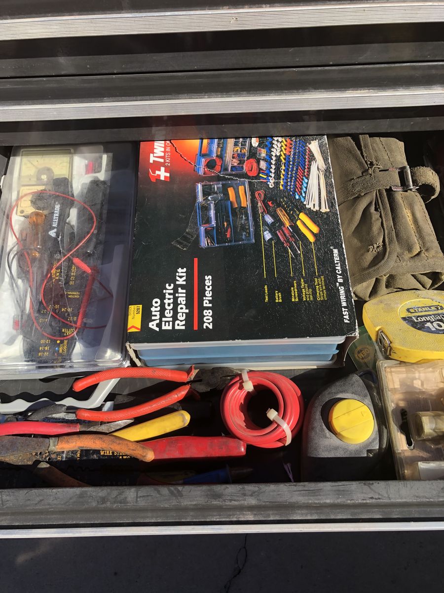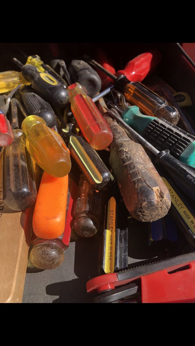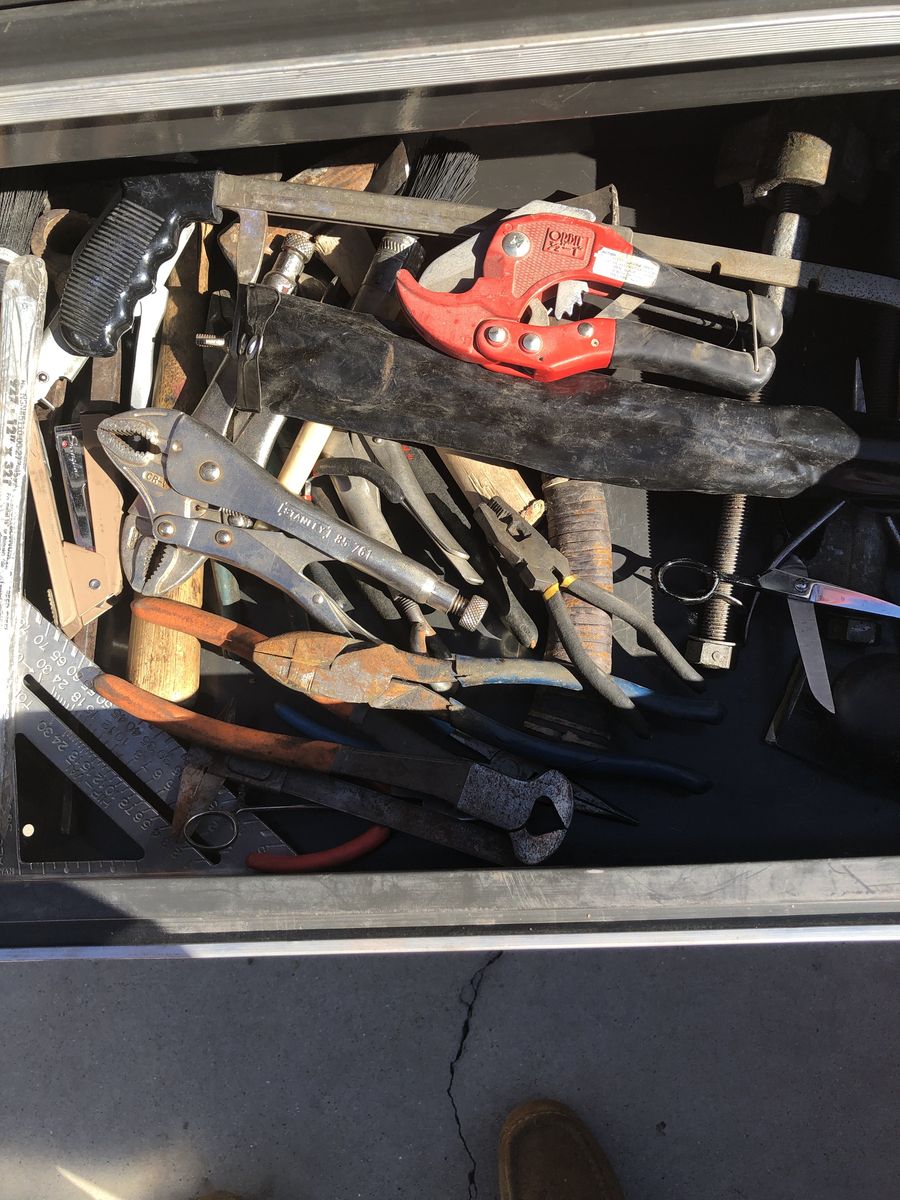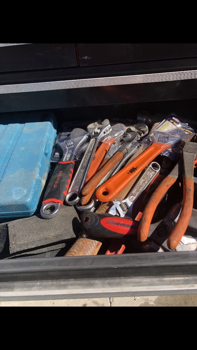 Craftsman Tool Box 12 Drawers on the top box, and 6 Drawers and a large cabinet on the bottom with a swing door, that has a set of jumper cables, and crow bar. The bottom drawers are filled with miscellaneous tools that are included. Screw drivers, sockets, wrenches, pliers, dikes, ratchets, , hack saw just about everything you can think of no key take all $260.00!!